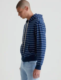 The Arc Zip Hoodie features a relaxed fit in 100% cotton French terry. Featuring a navy blue with white stripes, this cozy layer features an adjustable drawstring hood, roomy pockets at the front, and soft banded trim.