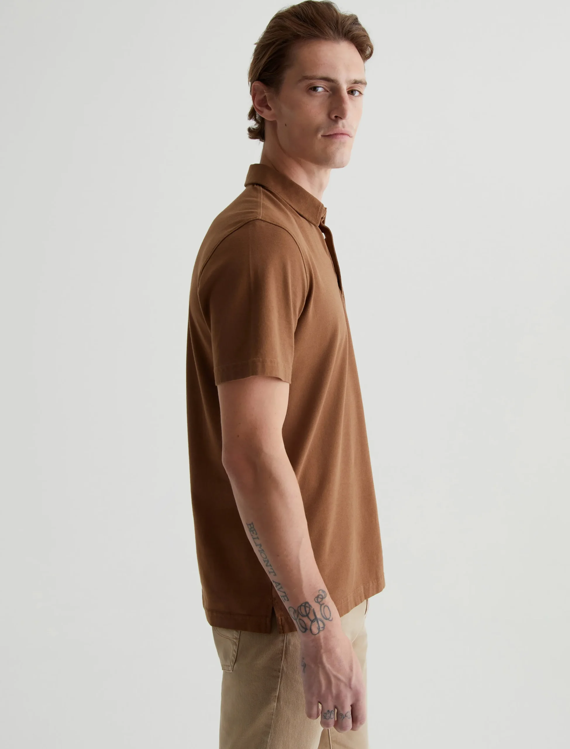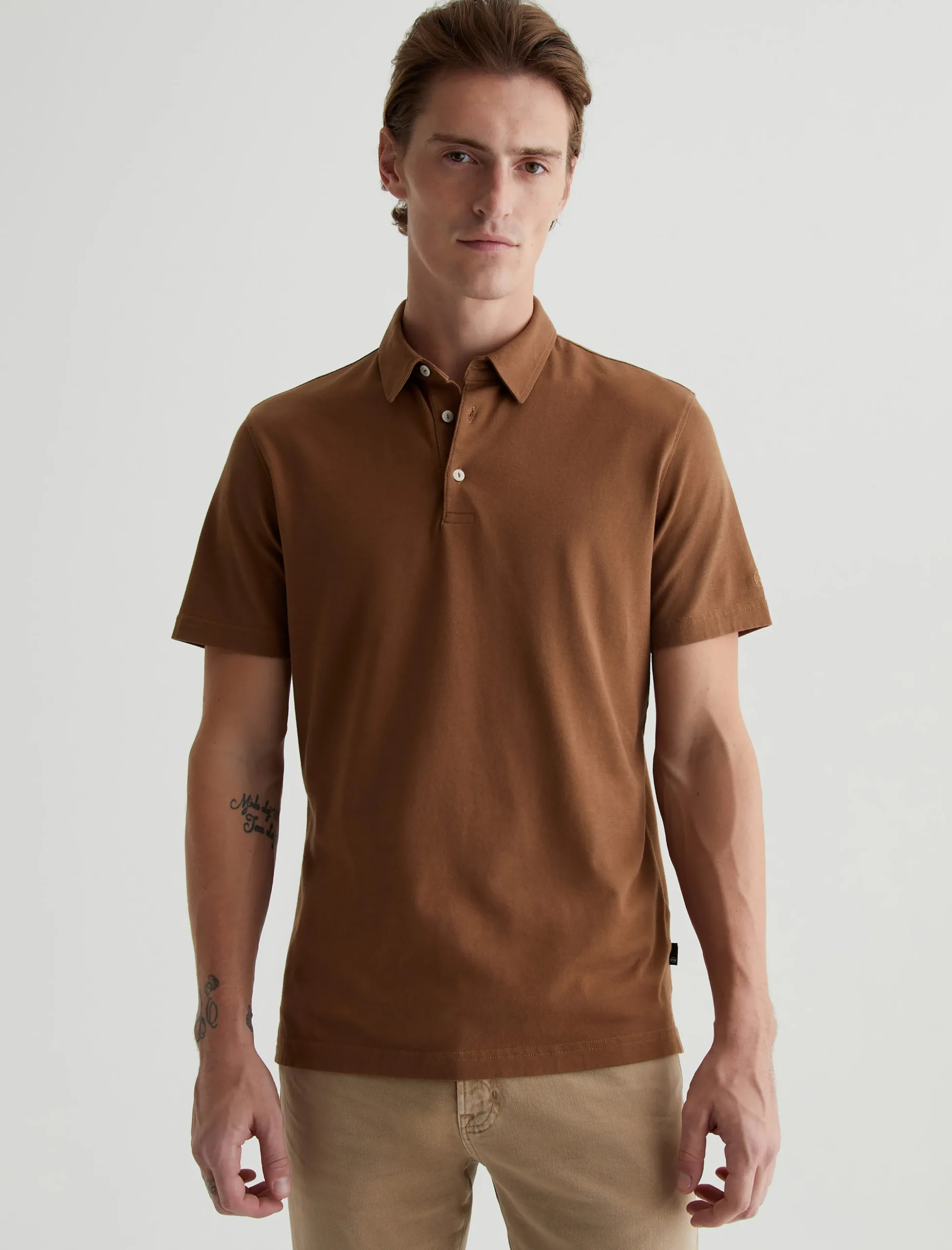 The Bryce Short Sleeve Polo in Spiced Birch offers casual polish with the comfort of your favorite tee. The self-collar offers a modern take on the classic polo shirt. This style is made from our Light Cotton Jersey that’s knitted with both S-twist and Z-twist yarns for longevity and stability, preventing unnecessary twisting and torquing. Detailed with the AG logo embroidered at one sleeve.