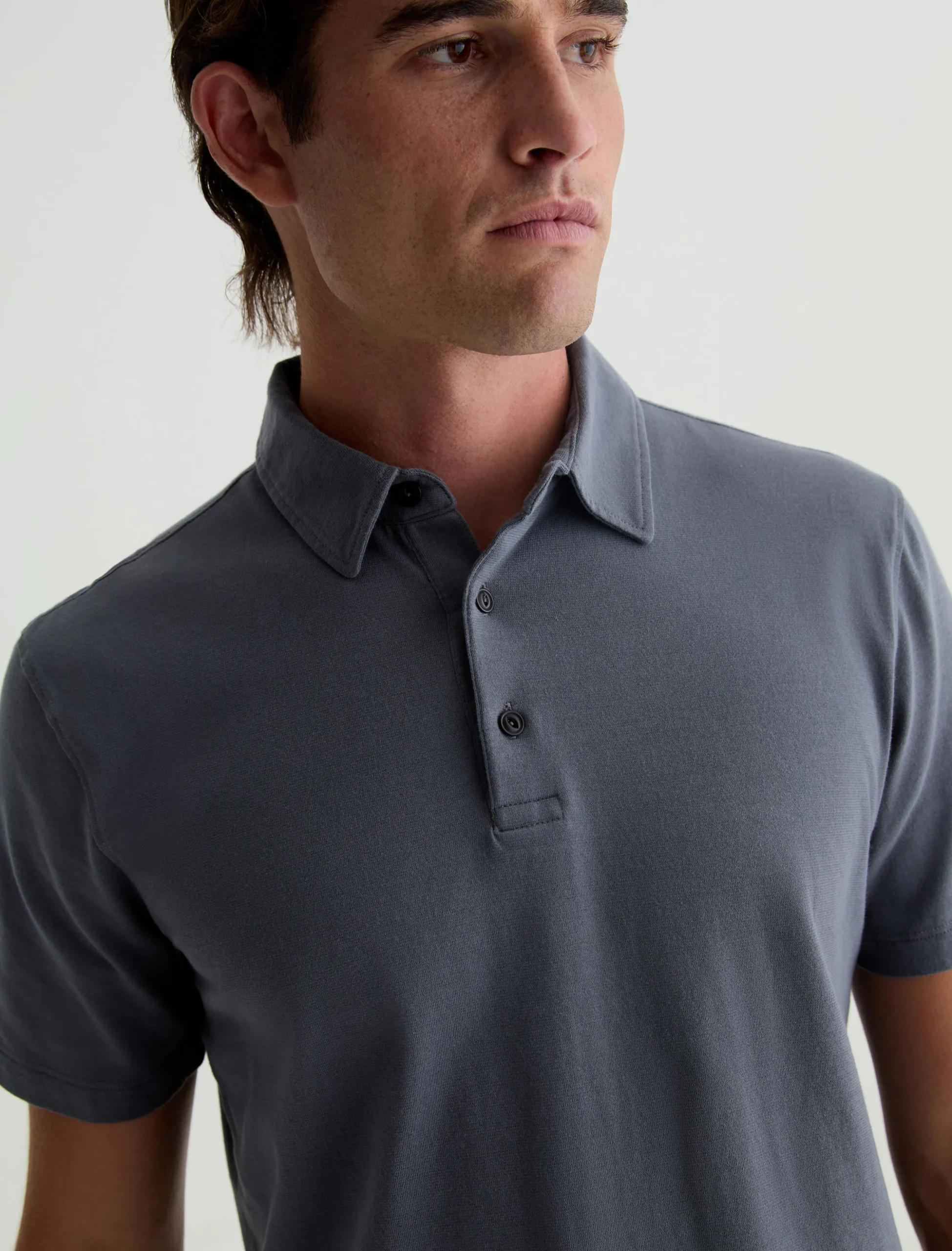 The Bryce Short Sleeve Polo in grey is a unique addition to our Basic Essentials assortment, made with our ultra-luxe jersey fabrication.The self-collar adds a modern take on your classic polo shirt. Our Jersey Knit offers a luxurious comfort that is unrivaled—knitted with both S-twist and Z-twist yarn to sustain longevity and stability, preventing unnecessary twisting and torquing. During the production process, the S-twist yarn is spun counter-clockwise creating a right-handed twill. The Z-twist yarn works in opposition, spinning clockwise for a left-handed twill. This opposition—when working together—yields a softer, more durable fabrication and gives strength to the yarn making it more difficult to pull apart. Designed in 100% Cotton.