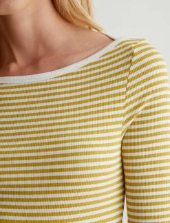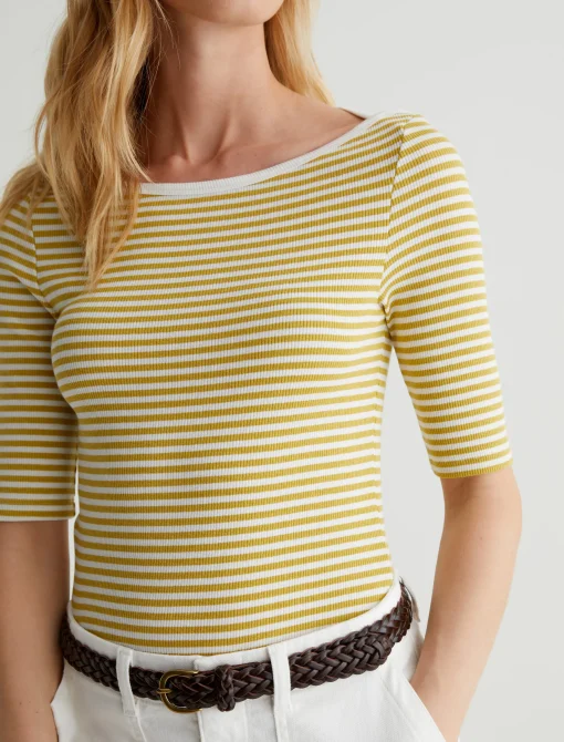 A nod to classic French styling, the Connie Top has a slim fit with an elegant boat neck and sleeves that land just above the elbow. It’s soft and comfortable in a striped cotton-blend rib knit accented by white binding at the neckline.