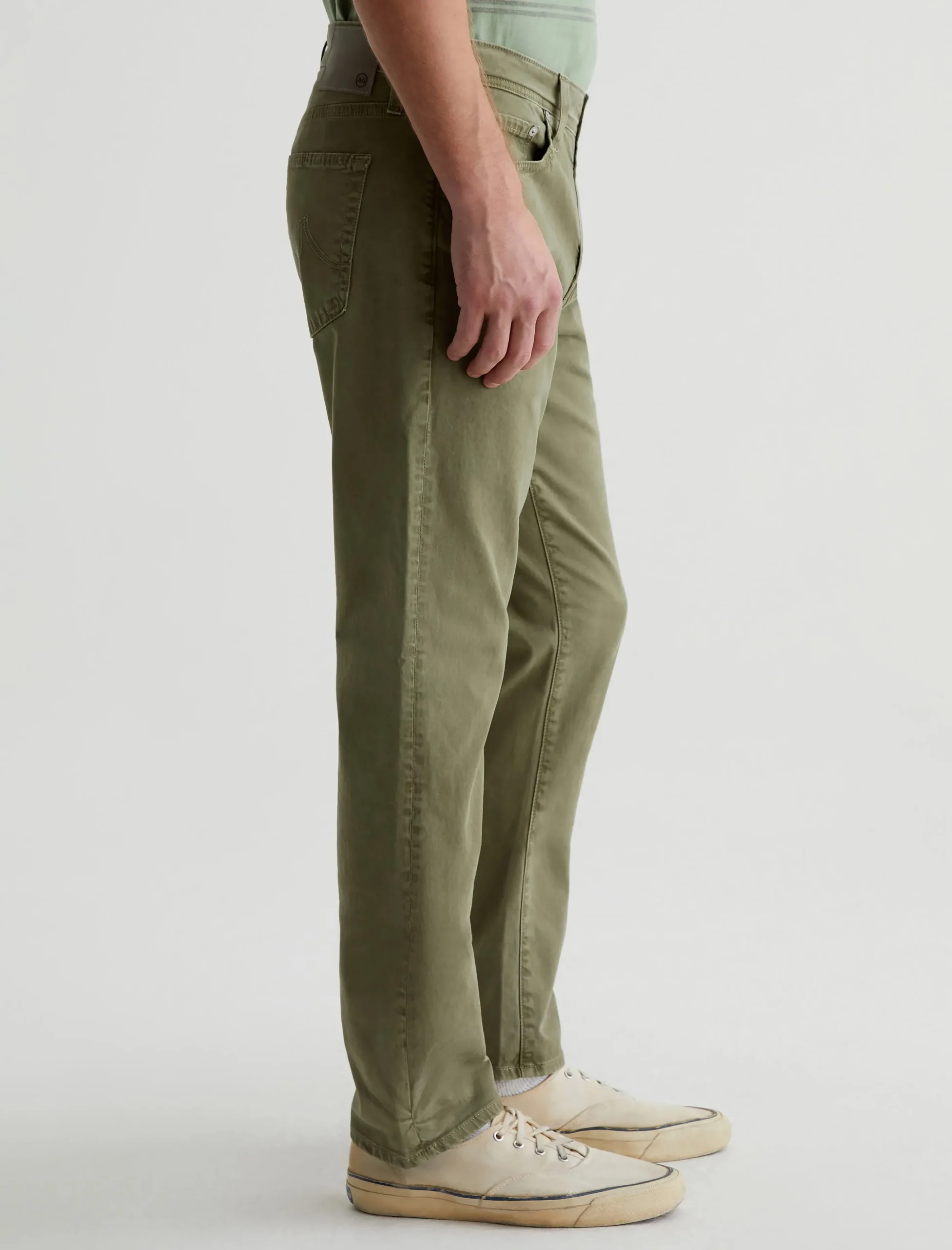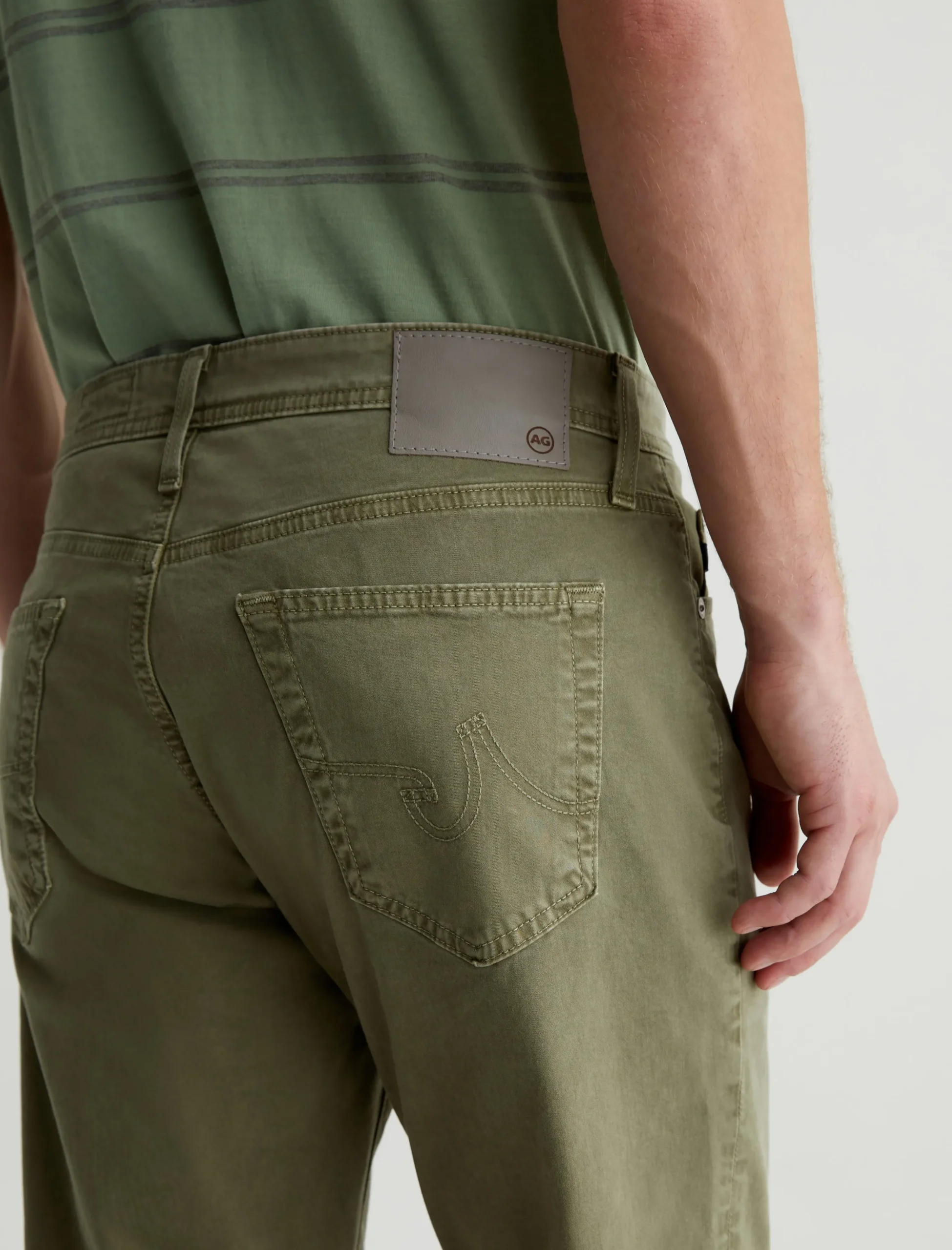 Our Everett slim straight men’s pants have a refined look and soft, supple feel in AG’s best-selling 8.4 oz. Sueded Stretch Sateen from Italy. It’s sulfur-dyed for an army green shade with a slightly faded look. This pair features a comfortable mid-rise waist and a straight fit that’s relaxed from hip to the knee before slightly tapering at the leg opening.