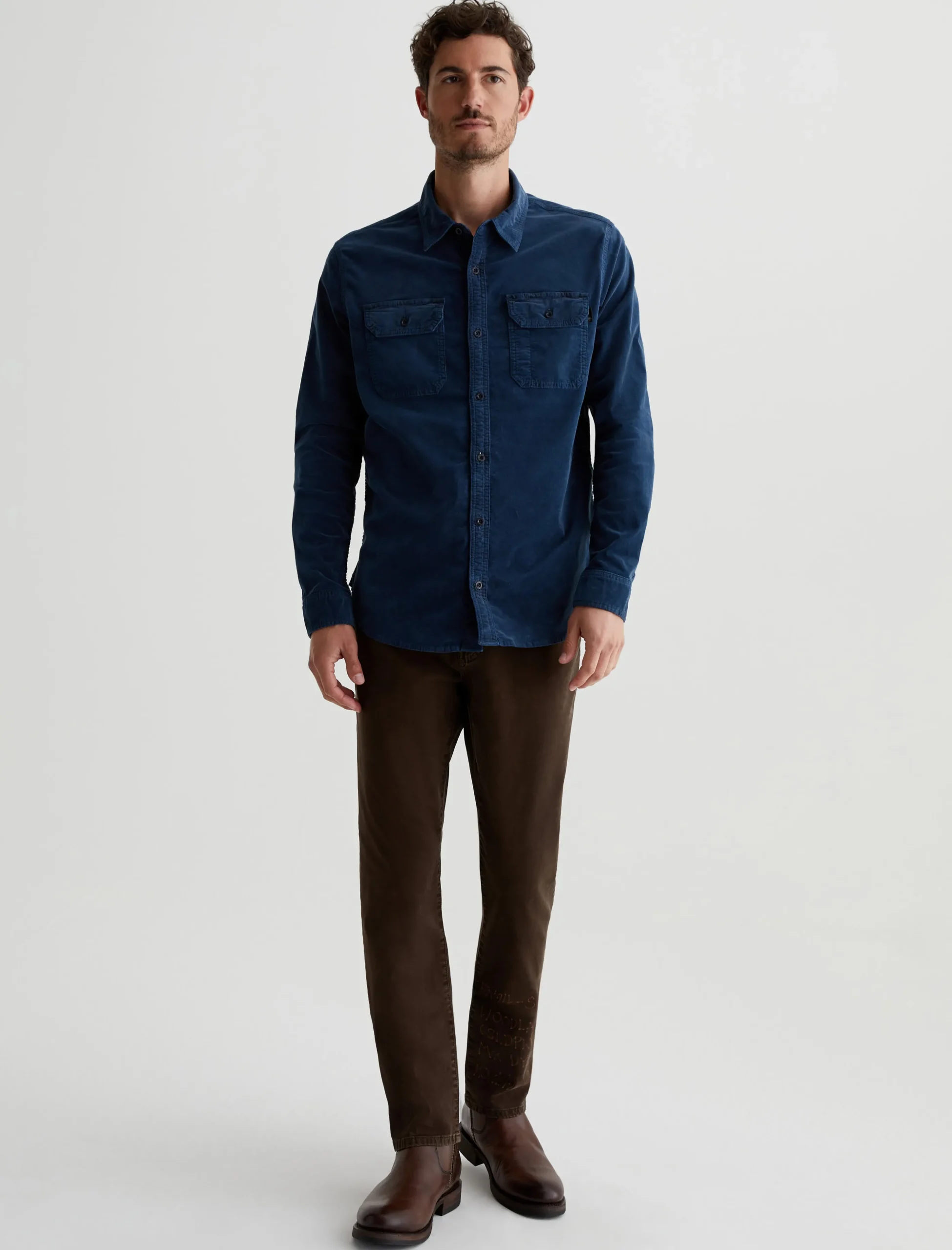 Our Everett slim-straight men’s pants have a refined look and soft, supple feel in AG’s best-selling 8.4 oz. Sueded Stretch Sateen from Italy. Sulfur-dyed for a dark brown shade, this pair has subtle variations of color at the seams and edges. The five-pocket style features a comfortable mid-rise waist and a straight fit that’s relaxed from hip to knee before slightly tapering at the leg opening.