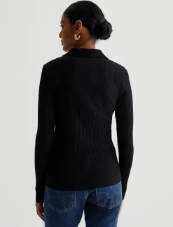 The Jolan Top features a long-sleeve silhouette with a soft, pointed collar and buttons down the front. Cut from a stretch-cotton rib knit in black, it’s cut for a slim fit that sits comfortably close to the body.