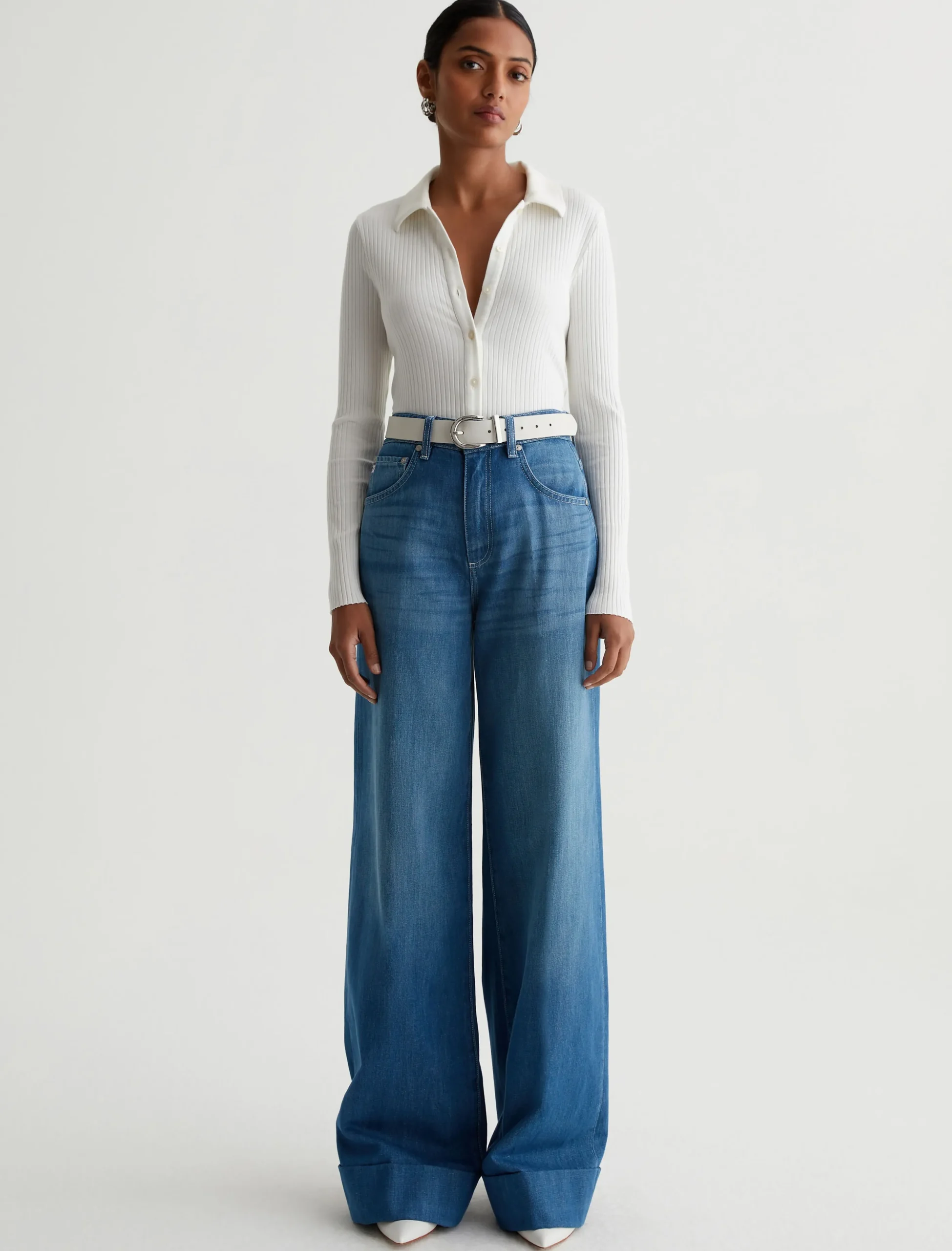 The Jolan Top features a long-sleeve silhouette with a soft, pointed collar and buttons down the front. Cut from a stretch-cotton rib knit in off-white, it’s cut for a slim fit that sits comfortably close to the body.