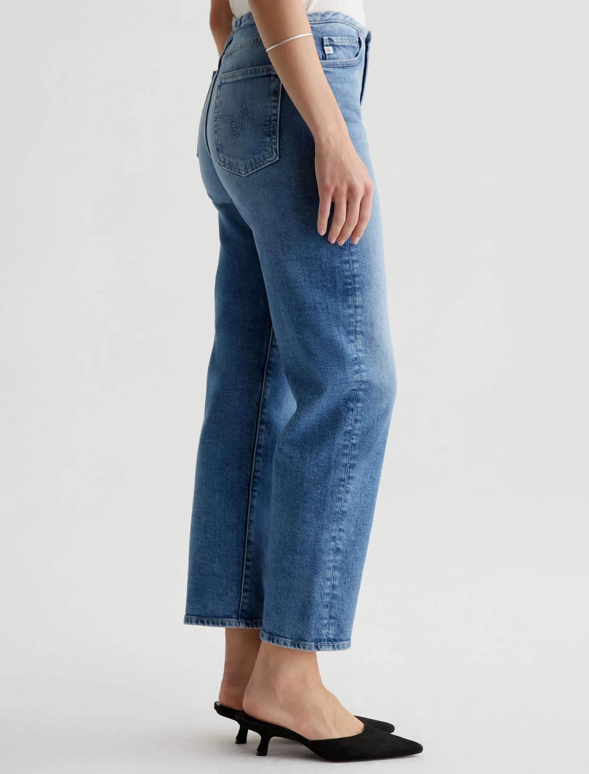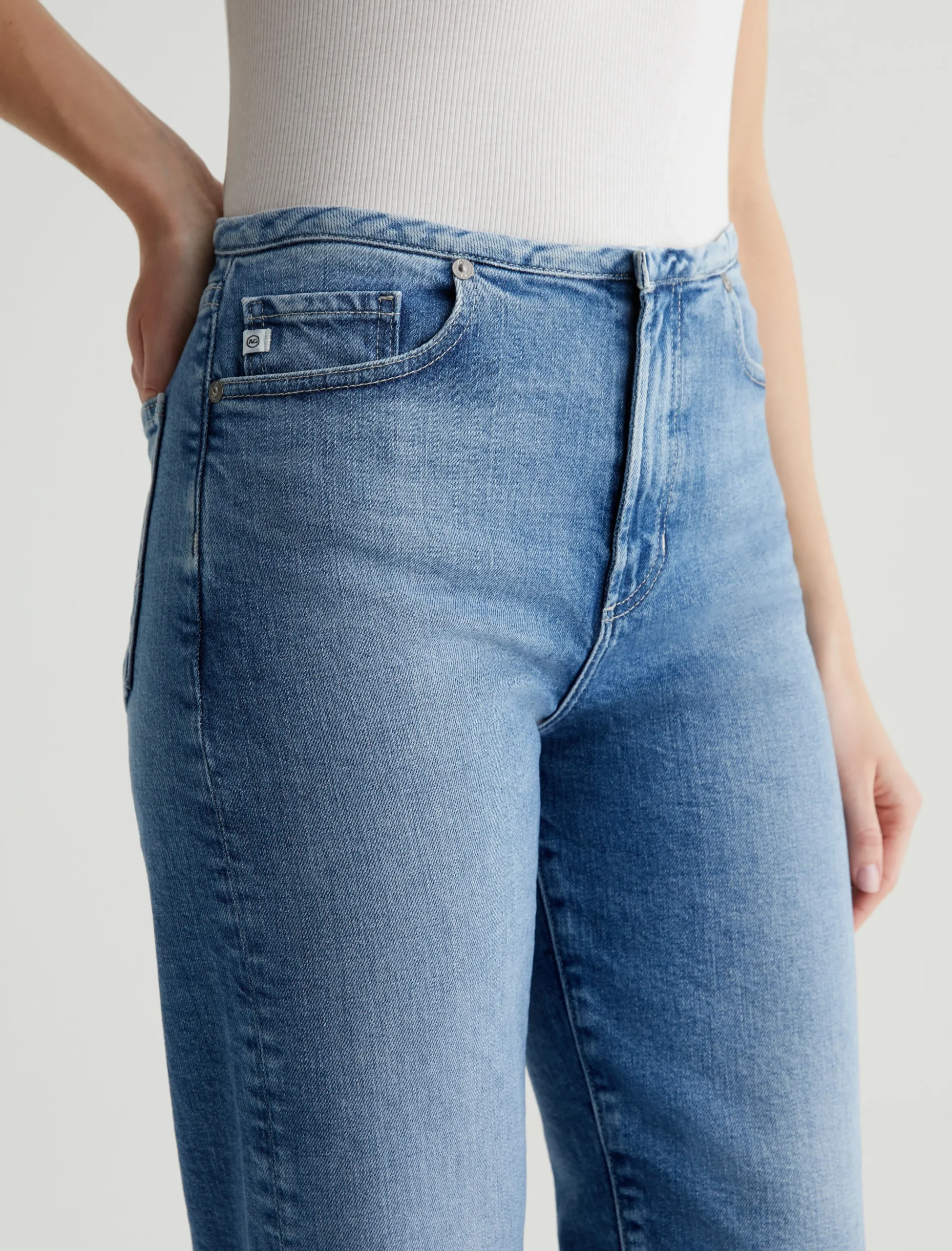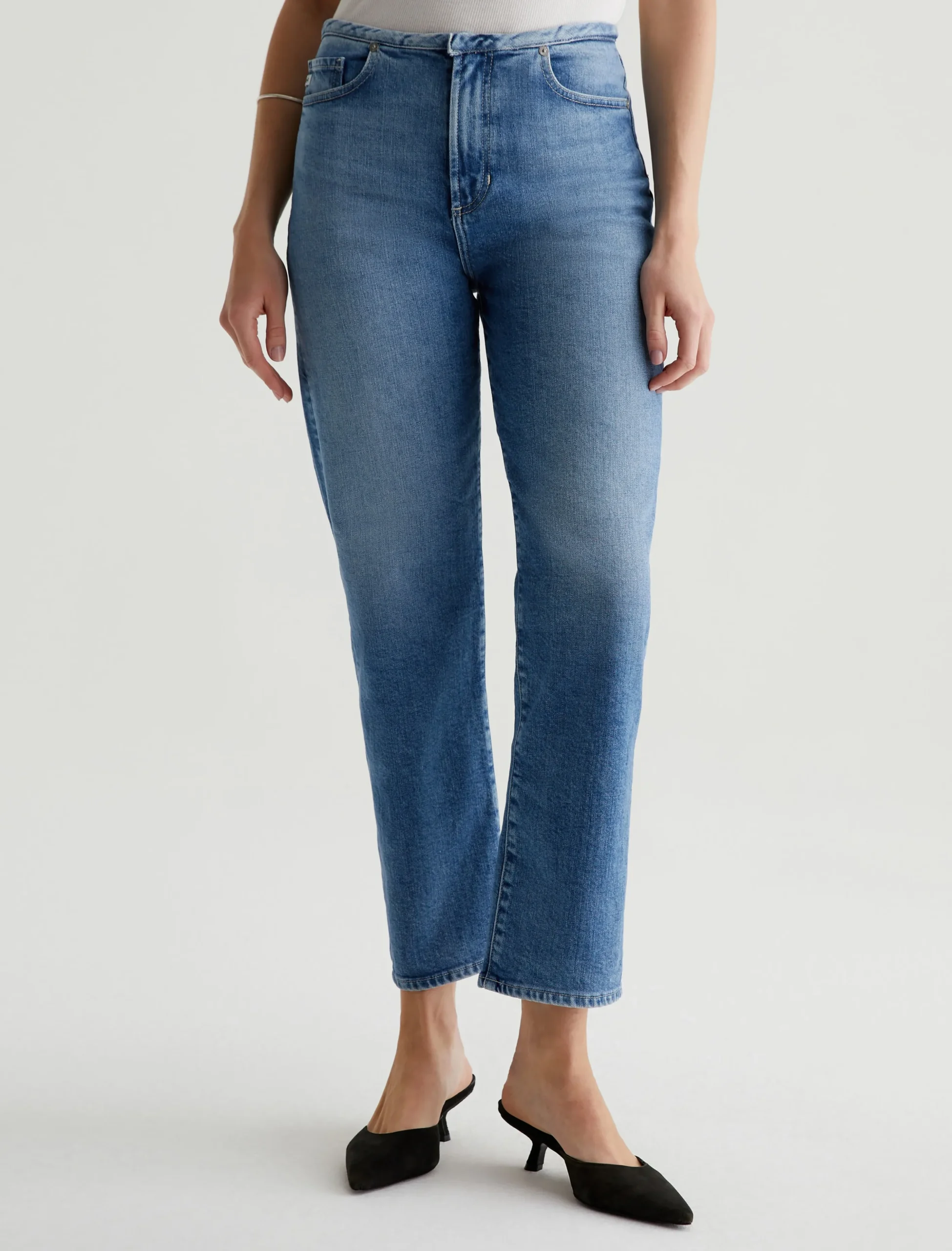 Our Rian high-rise straight, updated with a chopped waistband. It’s got a zip fly with a concealed button closure. The pair has a super-high waist and a roomy cut through the hips and legs, landing at an ankle-skimming length. These five-pocket women’s jeans are crafted from 11.75 oz. Vintage Comfort Stretch Denim in a faded light indigo wash.