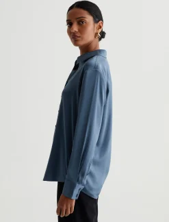 The Shiela button-up shirt is an AG favorite elevated by luxurious stretch silk in blue. The long-sleeve style has a classic fit with pointed collar and an exposed button placket. An easy piece to dress up or wear with jeans for a more casual look.