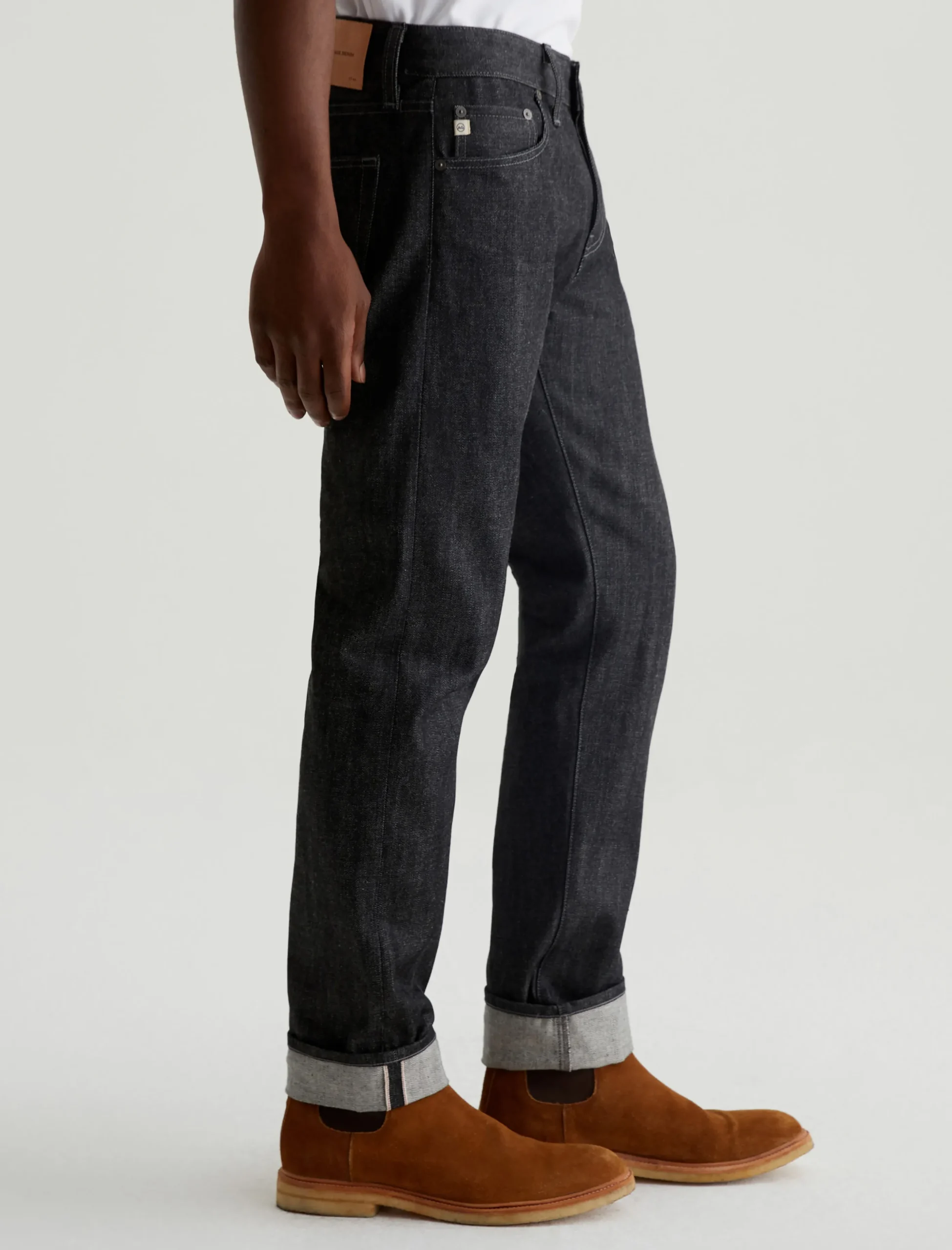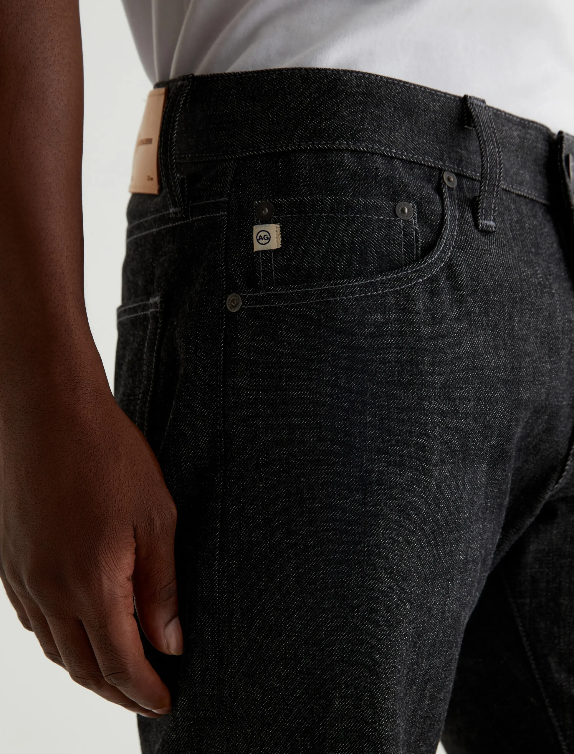 The Tellis Modern Slim Jean for men features midweight 12.89 oz. Black Rigid Selvage Denim from Japan’s Kuroki Co. The style is designed with a fitted top block and a tapered leg opening. This men’s slim straight jean has 3×1 right-hand twill construction in 100% cotton that’s grown in the USA and spun for a subtle slub character. It’s roped-dyed for a black cast and detailed by a red ticker along the self-finished edge.