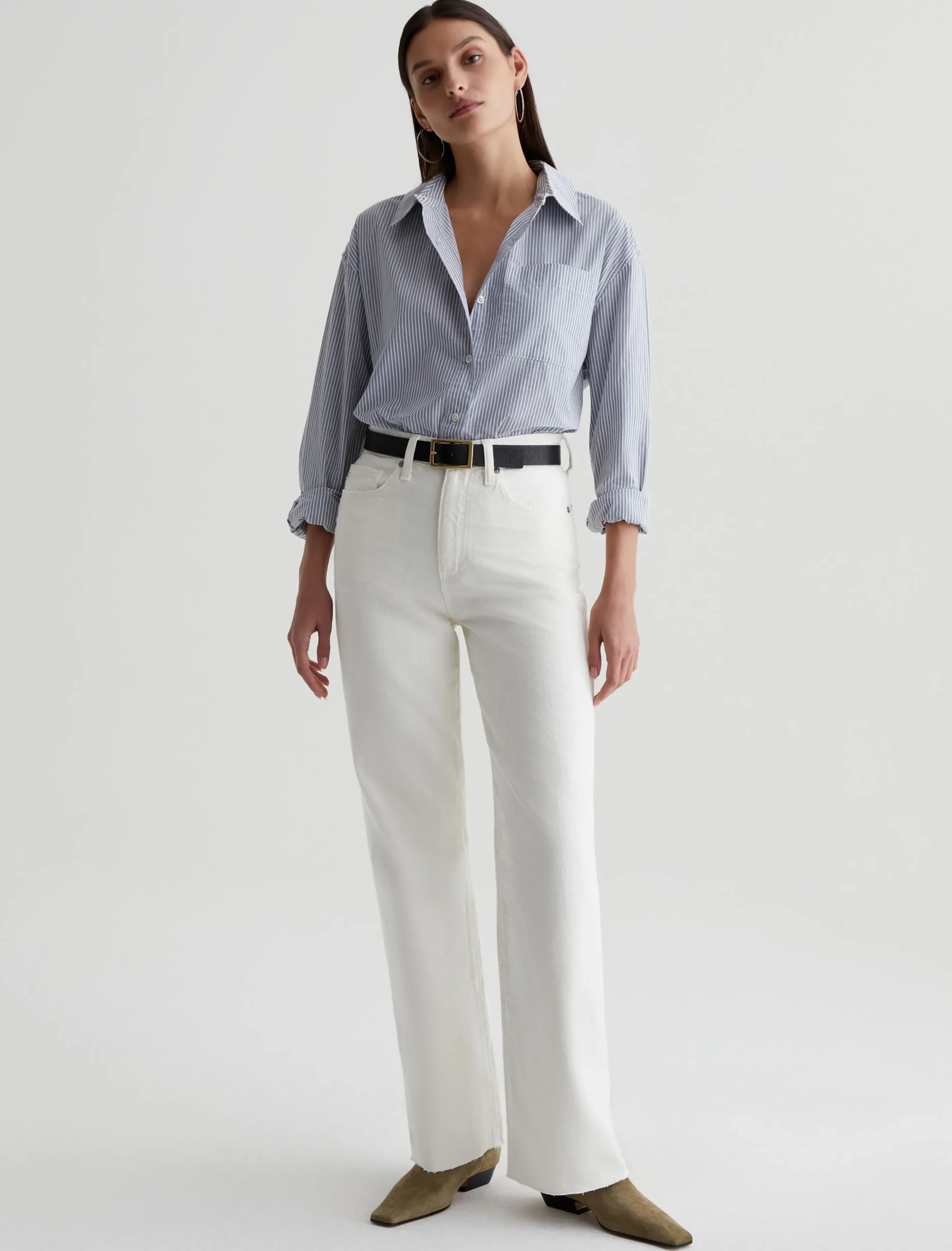 The Addison Shirt takes inspiration from vintage men’s styles. Made from crisp cotton poplin with blue and white stripes, this long-sleeve button-up has a relaxed, oversized fit with pointed collar, dropped shoulders, and a shirttail hem. Finished by a single patch pocket at the chest, plus a small AG logo at the left side.
