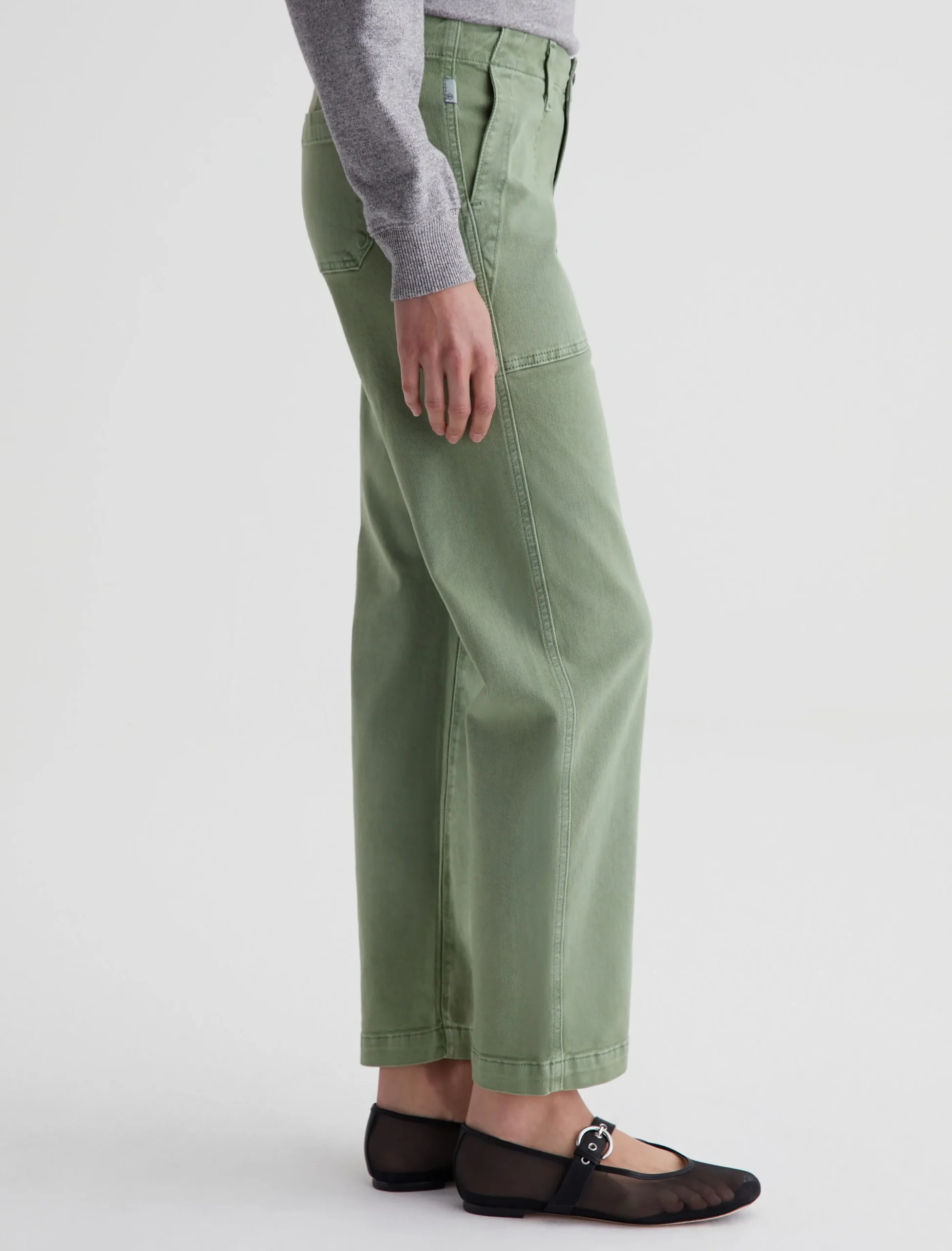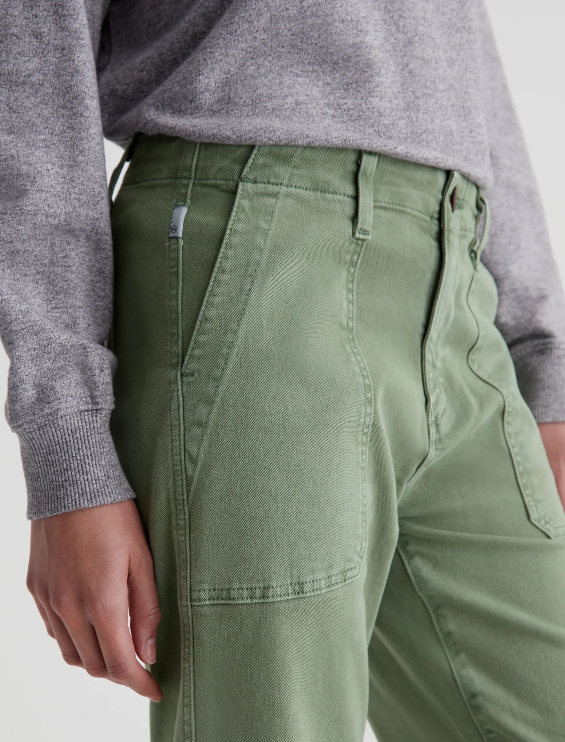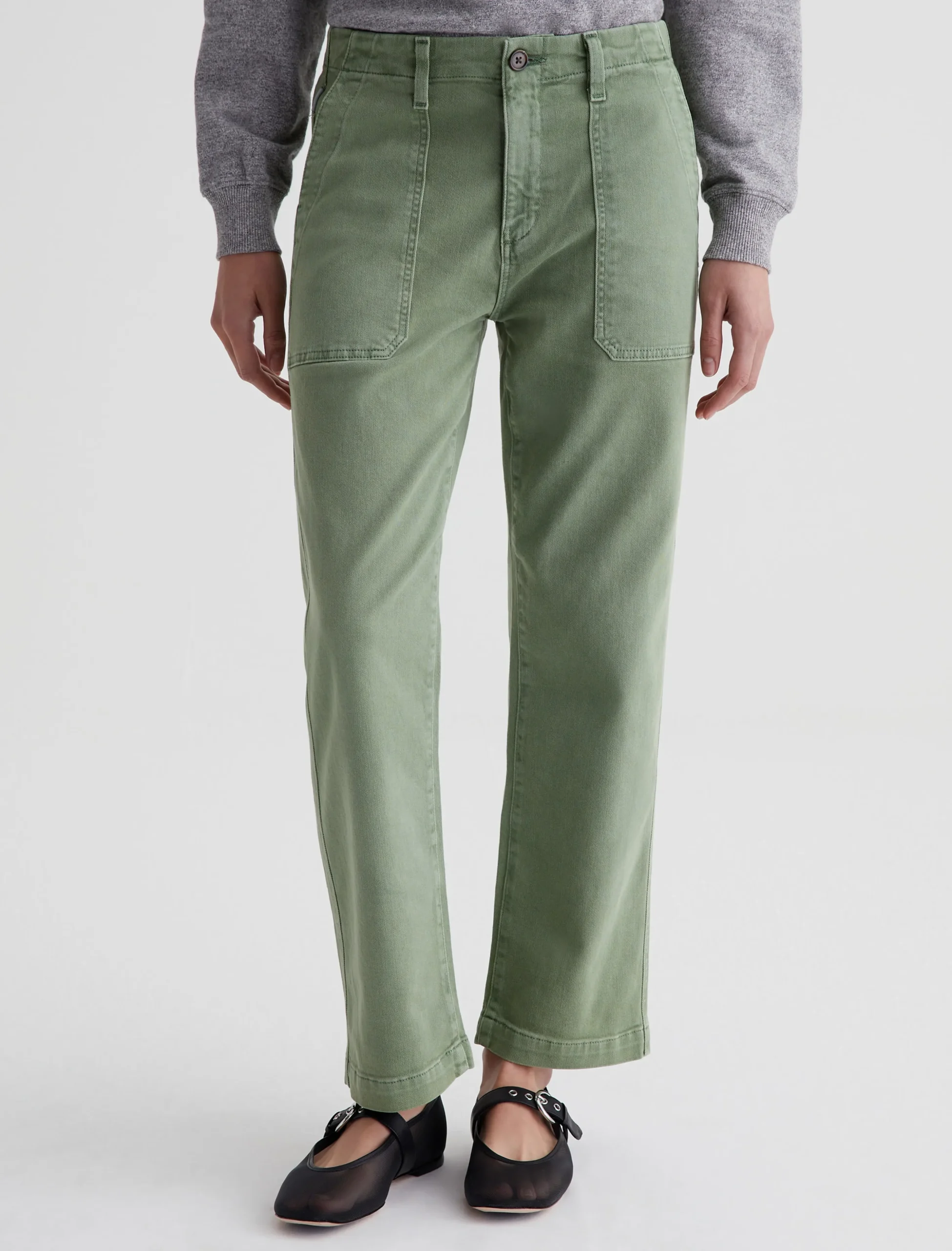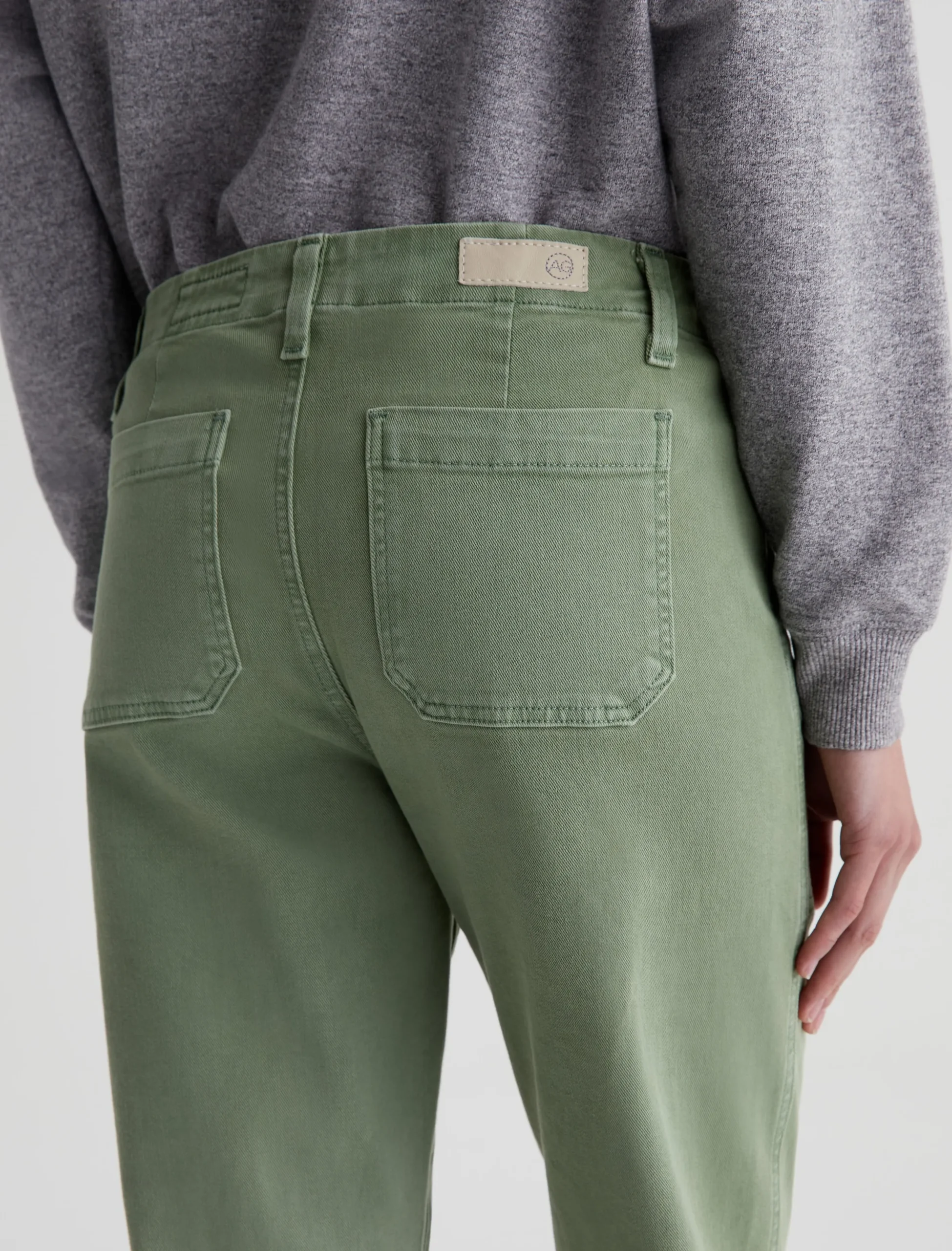 Analeigh is a high-rise straight crop with workwear-inspired pockets. Done in a sulfur-dyed green shade, these cropped pants for women are crafted from 8.7 oz. Hyper Soft Bull Denim featuring subtle stretch. This AG Cloud Soft Denim™ fabric has a special left-hand twill construction that allows the yarns to gently relax and untwist for a supple, velvety feel.It’s designed to get softer with every wear.