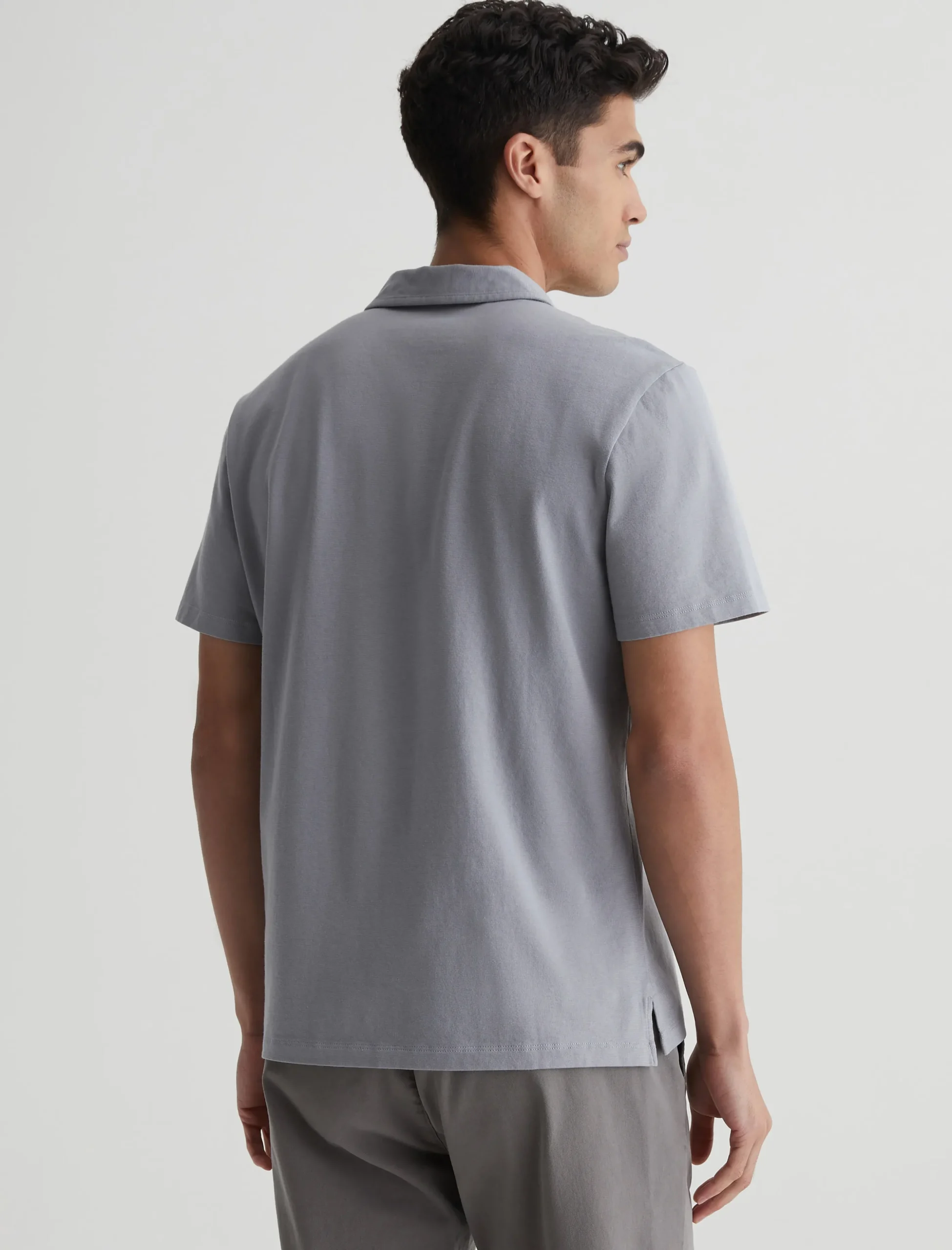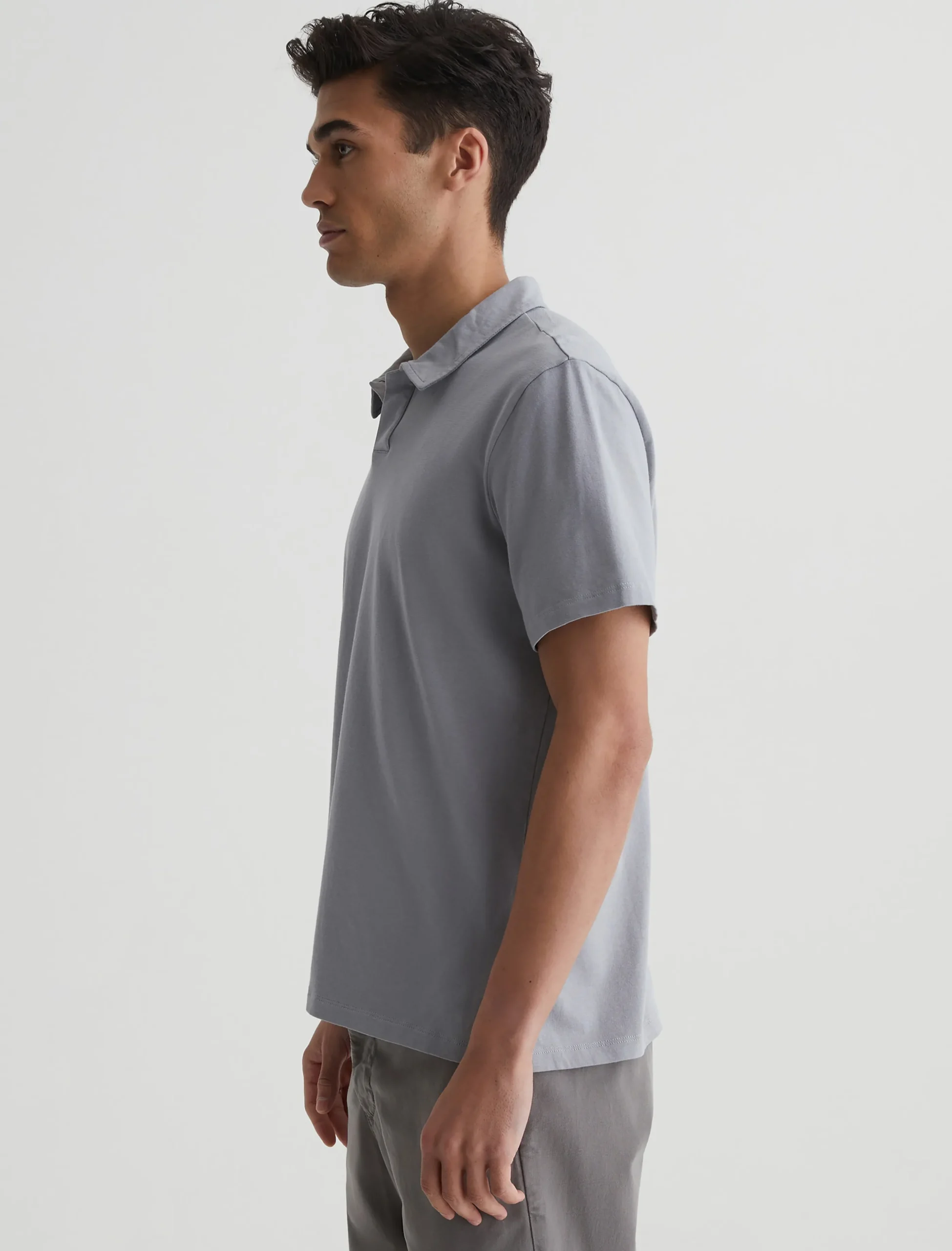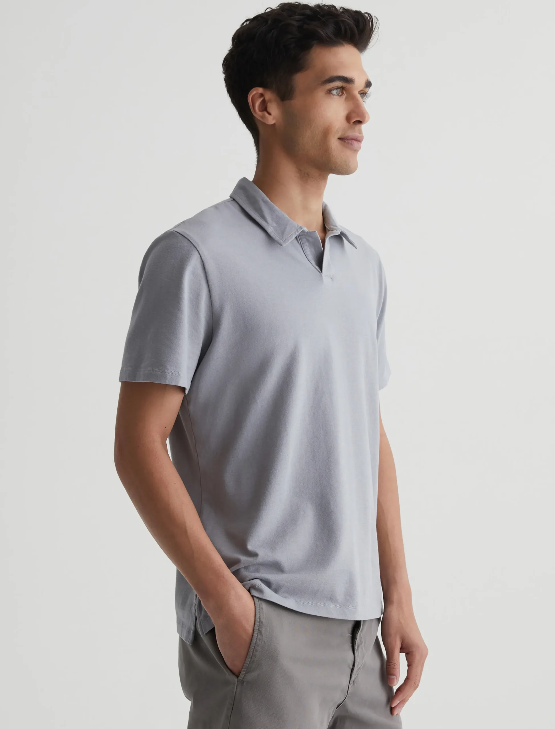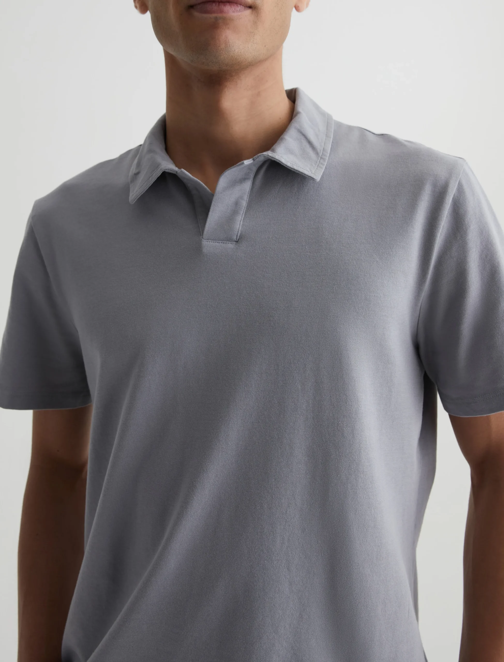 The Bryce Johnny Collar shirt is a classic short-sleeve polo tee with a relaxed neckline and pointed collar. Made from our Light Cotton Jersey in pale grey, it’s soft and easy to wear year-round.