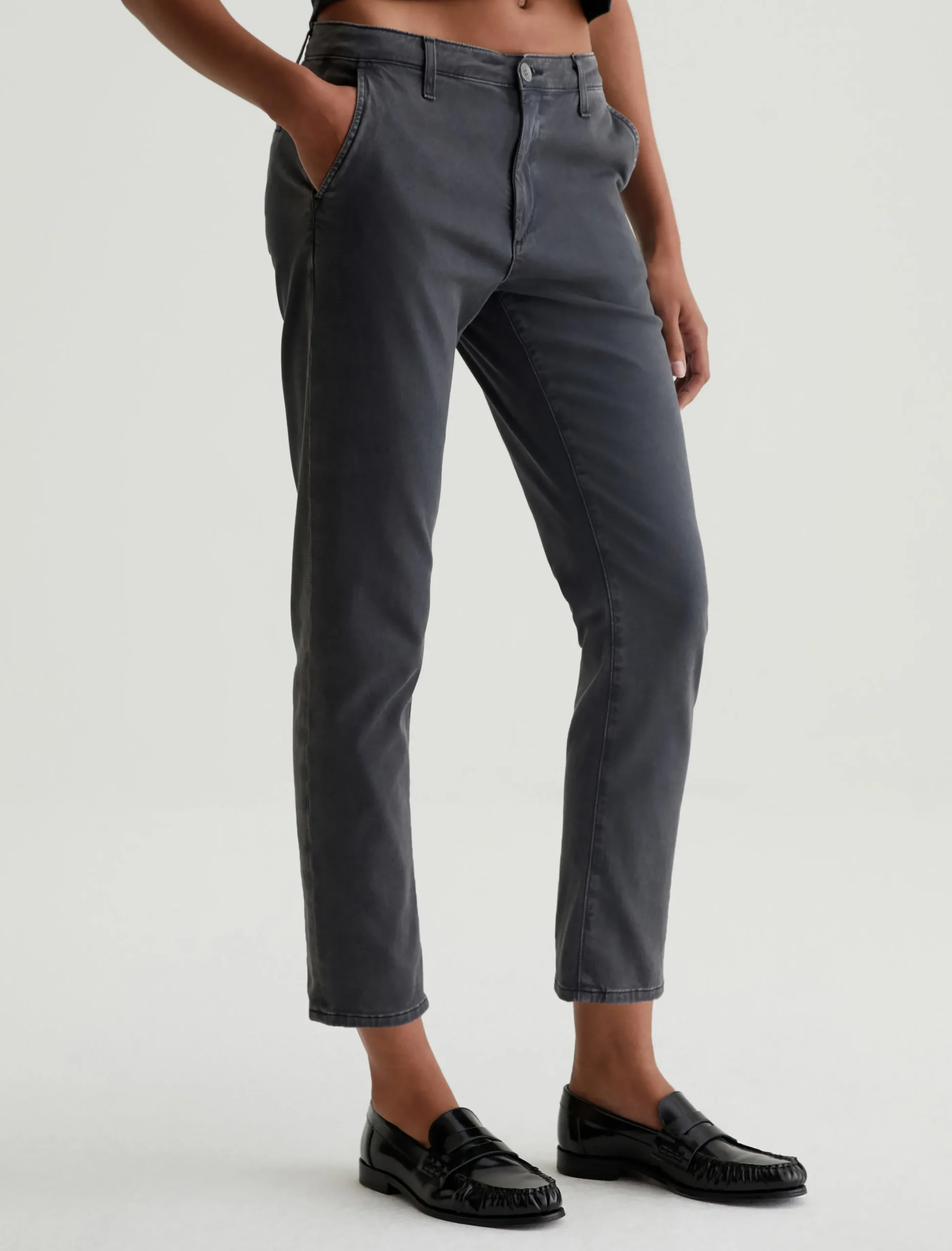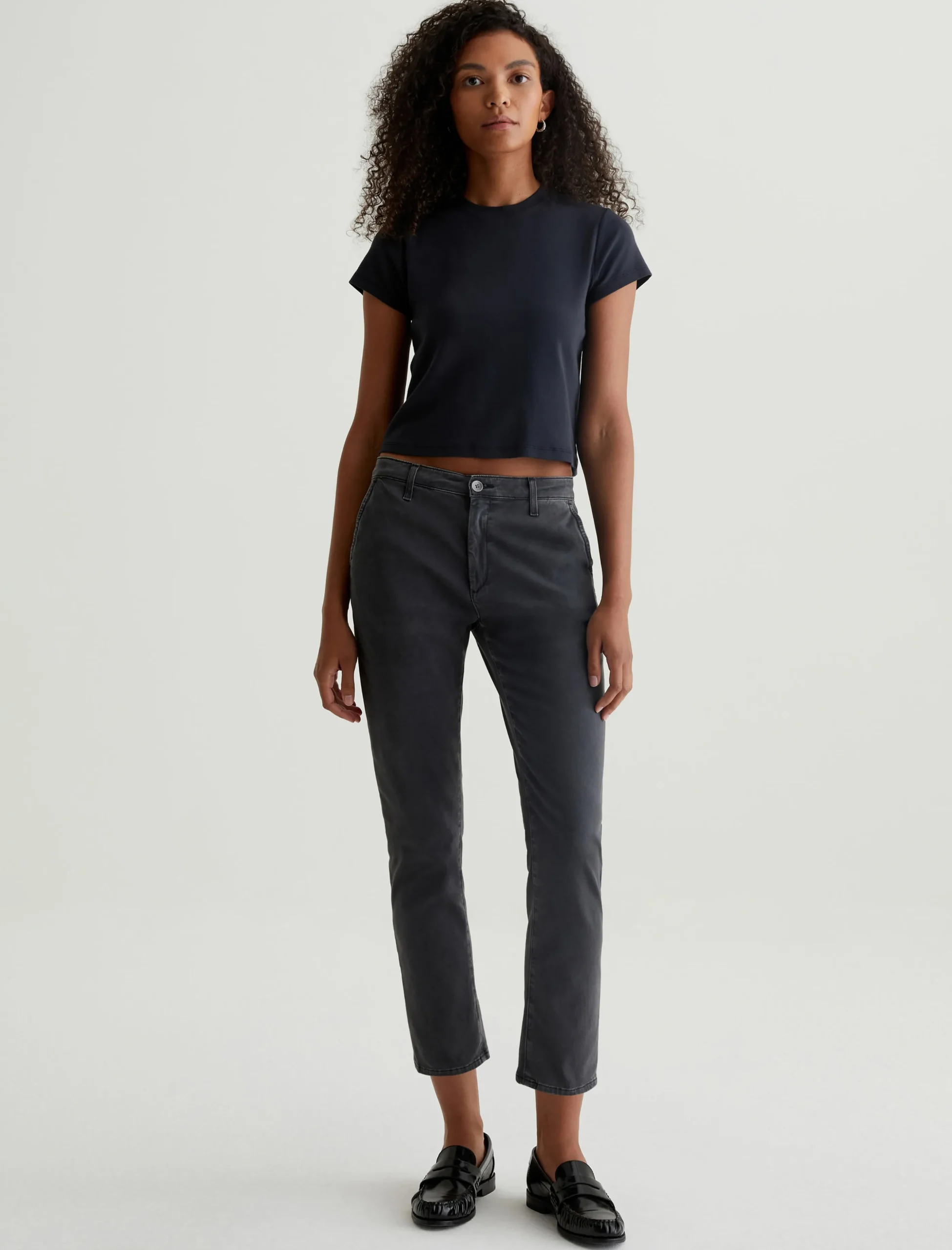 Caden is a tailored trouser crafted from our 7.5 oz. Sumptuous Stretch Broken Twill in a sulfur-dyed black shade with a faded look. This women’s pant has a relaxed fit at the hips and a gently tapered shape through the legs, finishing in a cropped length that lands above the ankles. Detailed with slant front pockets and welt back pockets.