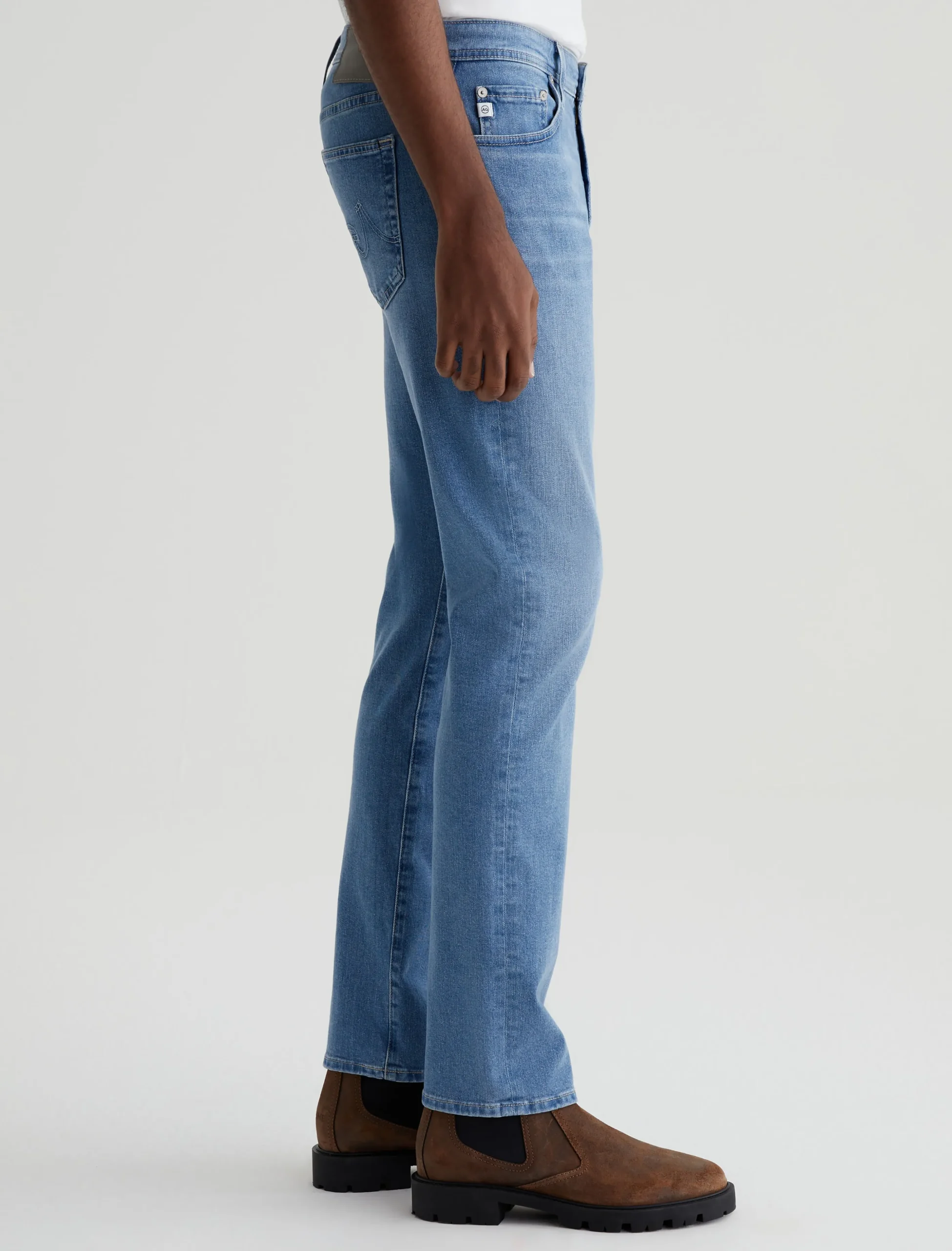 Everett is a slim straight jean for men, updated here in light, bright blue with a faded finish. The style has a mid-rise waist and a straight fit that’s relaxed from hip to knee before slightly tapering at the leg opening. Part of our exclusive AG Cloud Soft Denim™ offering, these men’s slim straight jeans are designed in 9.4 oz. Hyper Soft Indigo Denim. This fabric’s special left-hand twill construction allows the yarns to gently relax and untwist for a supple feel that gets even softer with wear. It’s got dual-elastic performance fibers built in for added stretch and recovery.