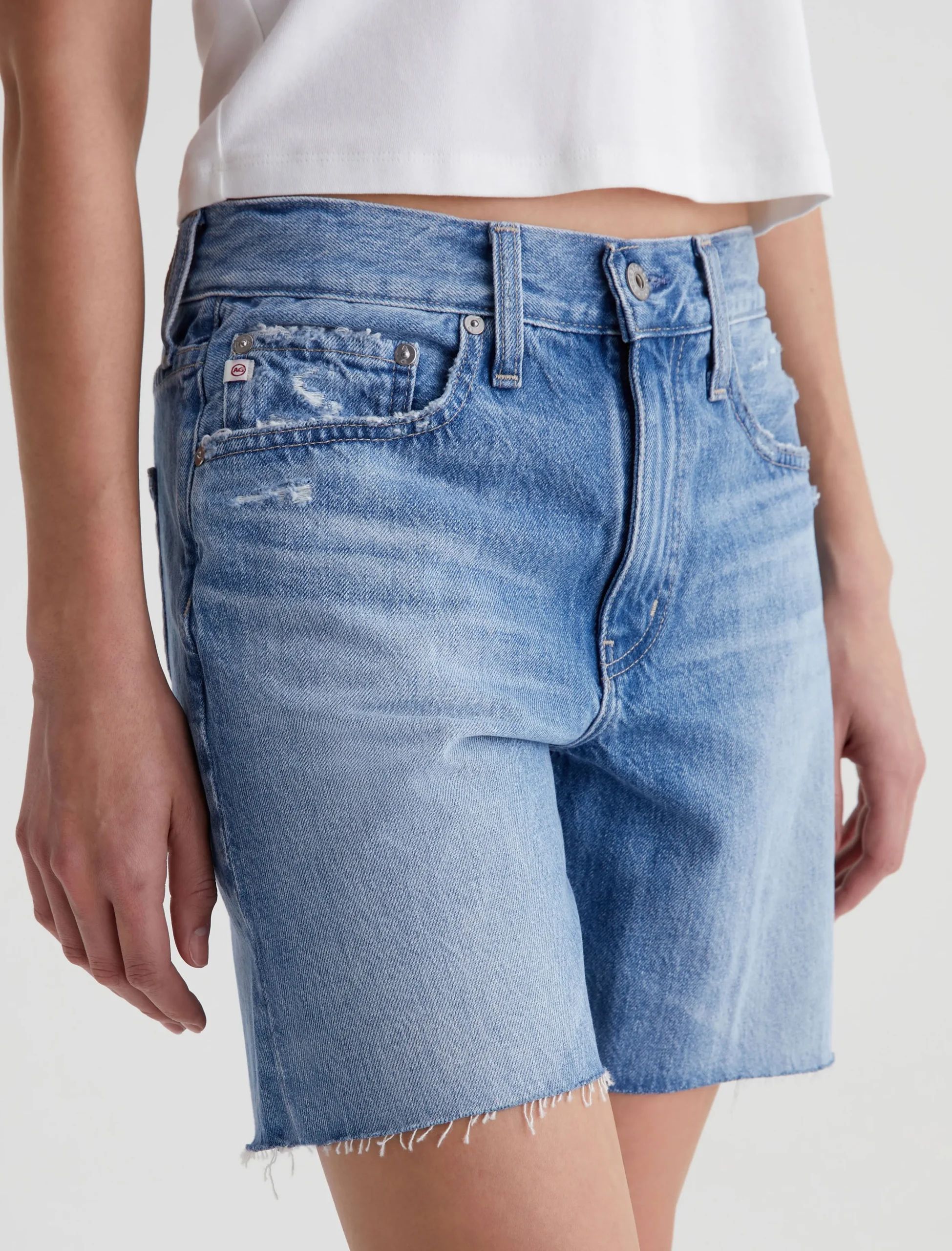 The Ex-Boyfriend Short is a mid-rise bermuda style with raw hems. Featuring a bit of ease for a slightly slouchy fit, these 5-pocket shorts are crafted from 13 oz. Sioux Rigid Denim in a light indigo wash with an AG-ed™ 18-year fade. Distressed pocket edges add to the vintage character.