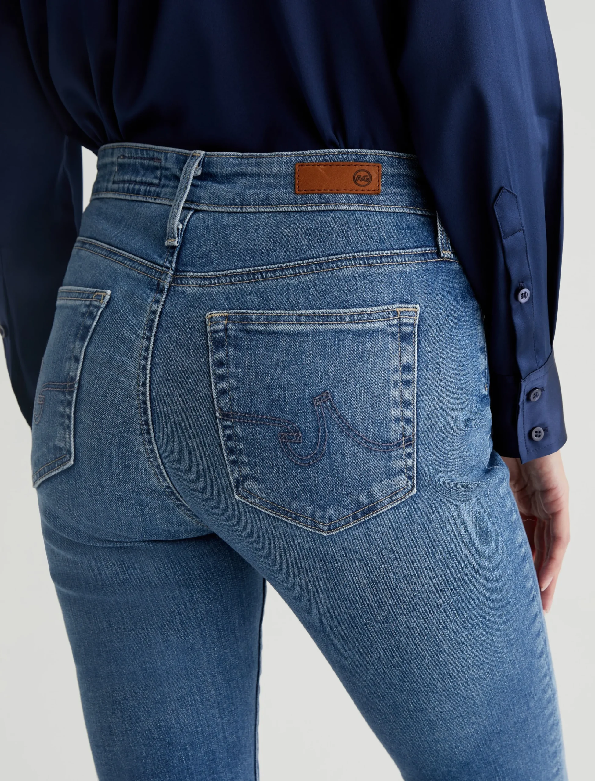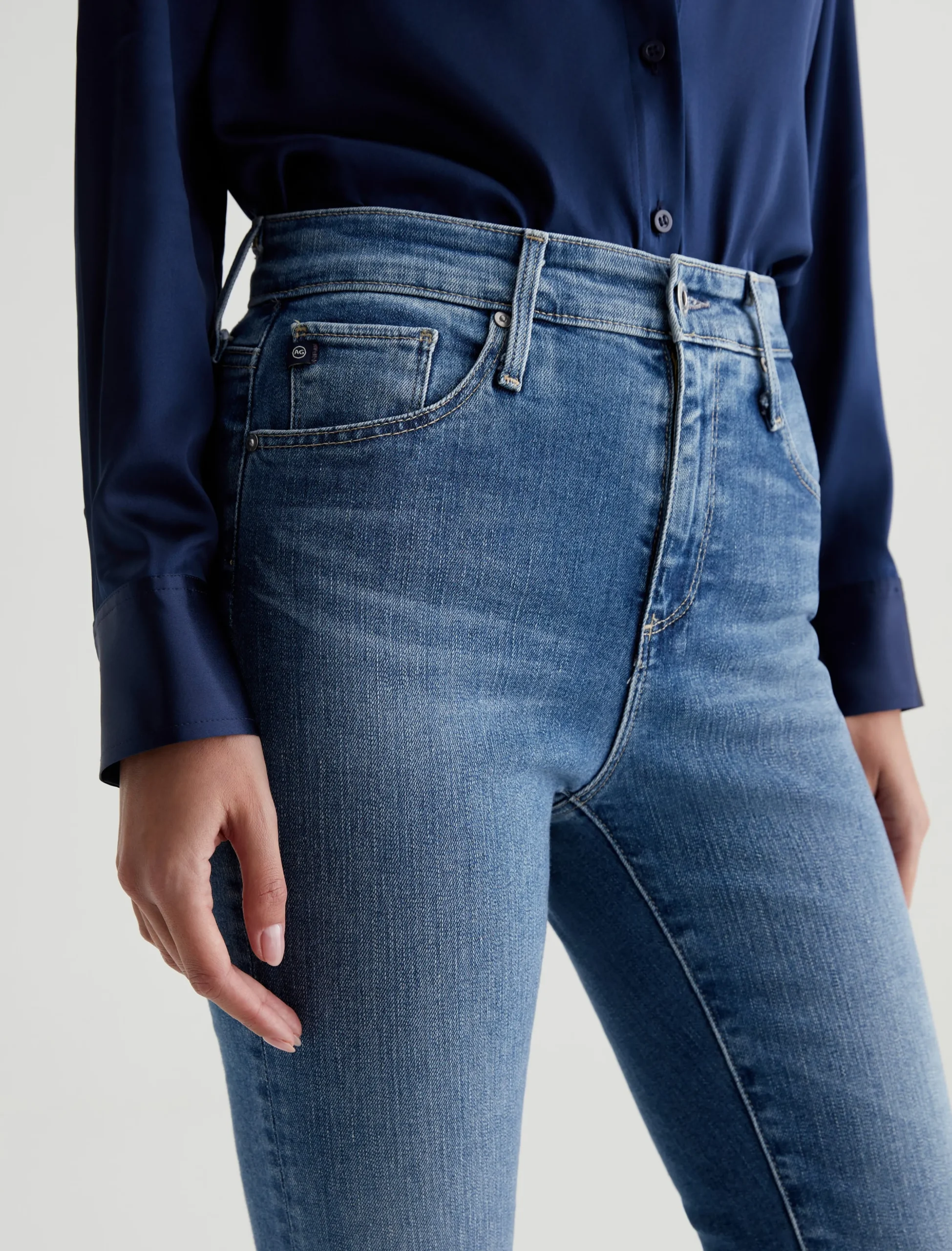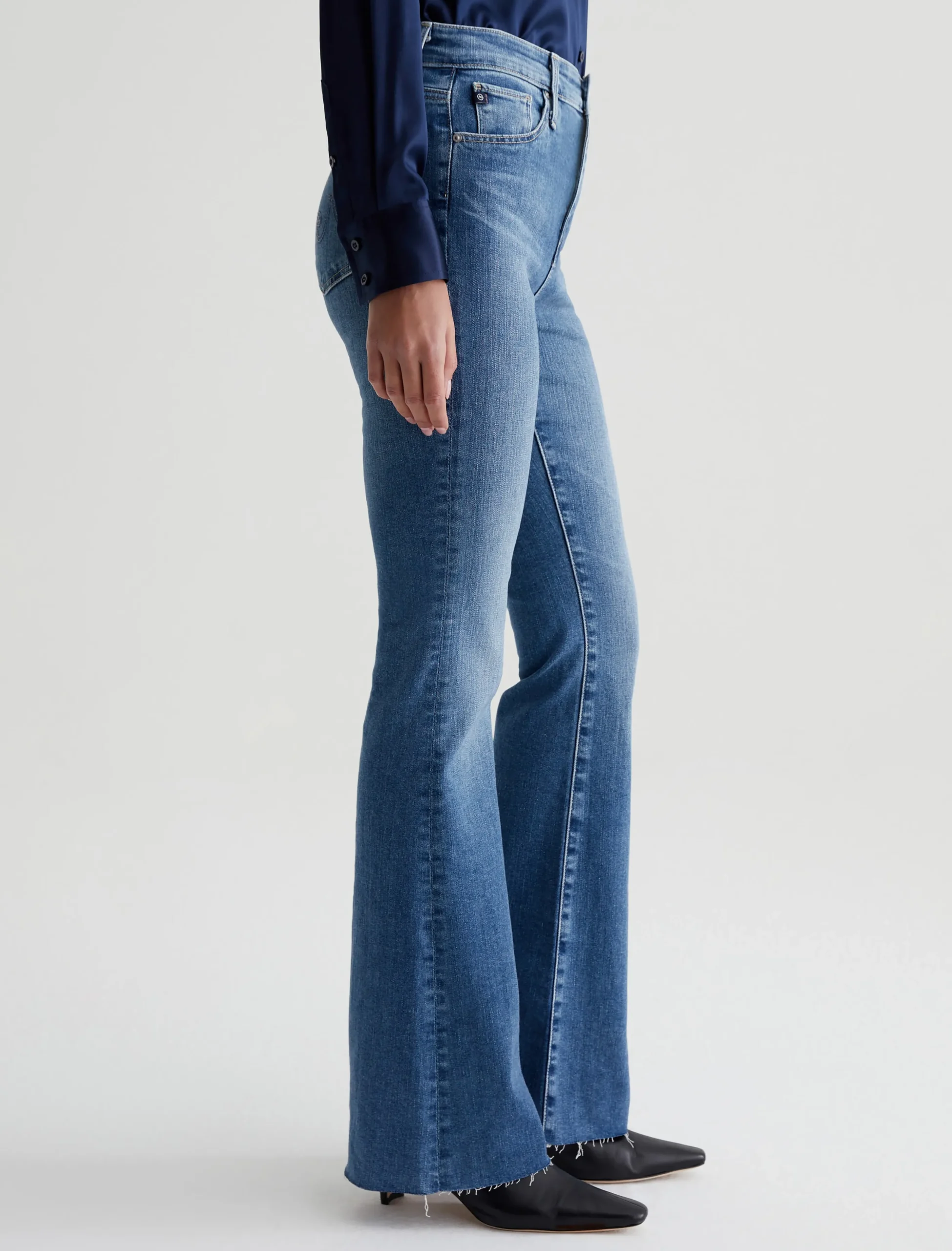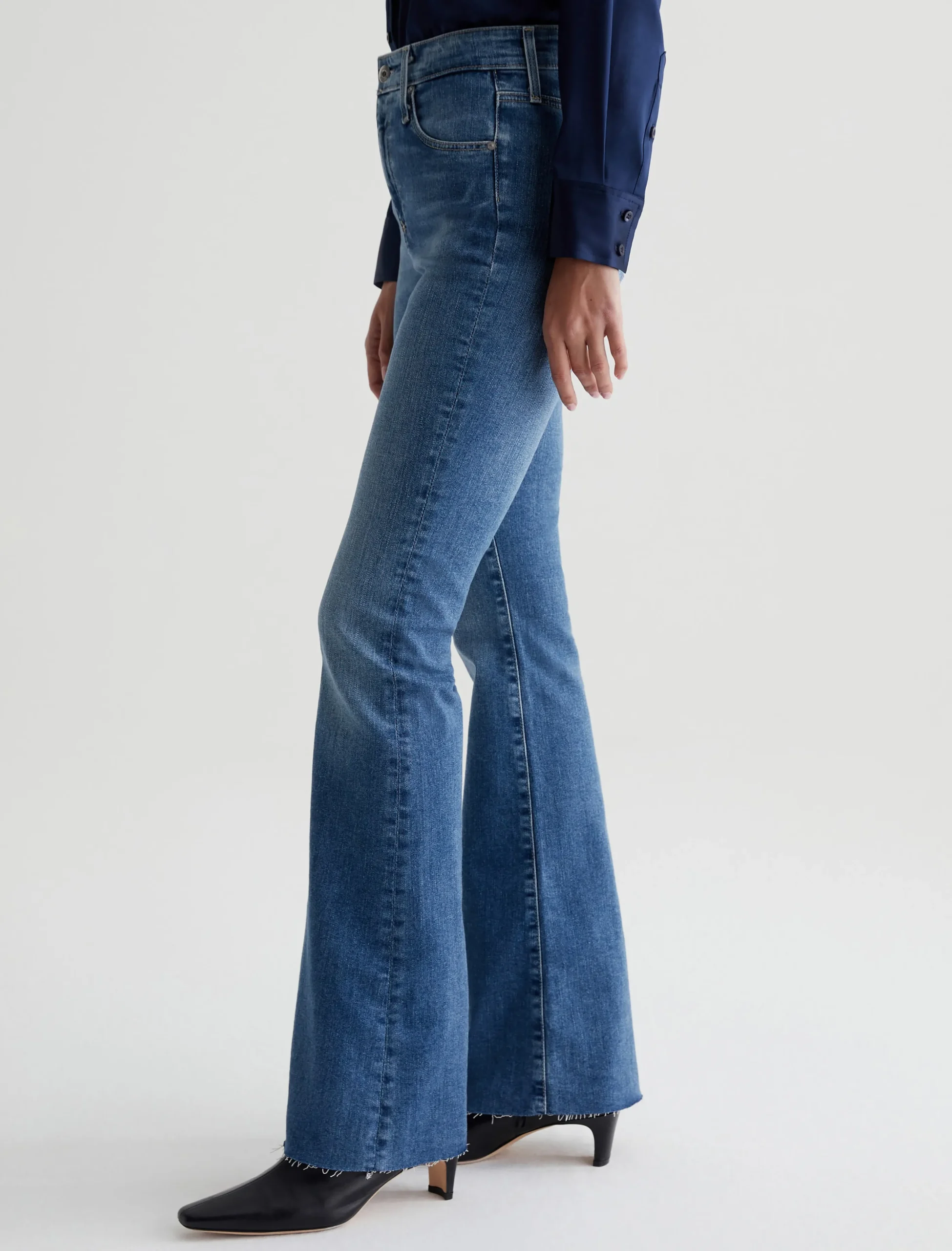 The Farrah Boot is our new mid-rise bootcut jean in a medium indigo wash with fading and whiskering. The pair sits right at the natural waist and has a skinny fit through the leg before opening into a subtly flared raw hem. This women’s bootcut jean is designed in 10 oz. Rouge Advance Stretch Denim for a flattering shape and added mobility.