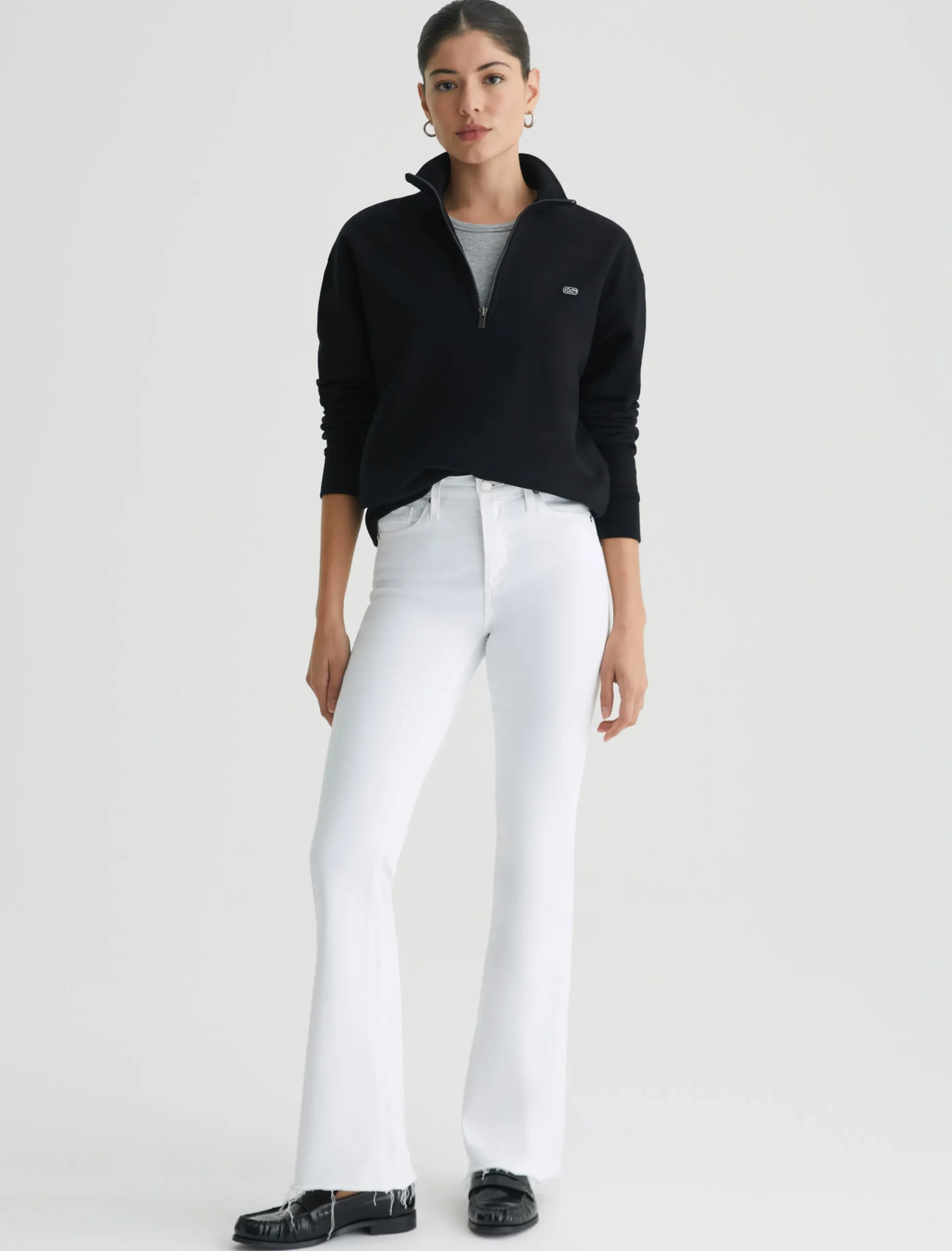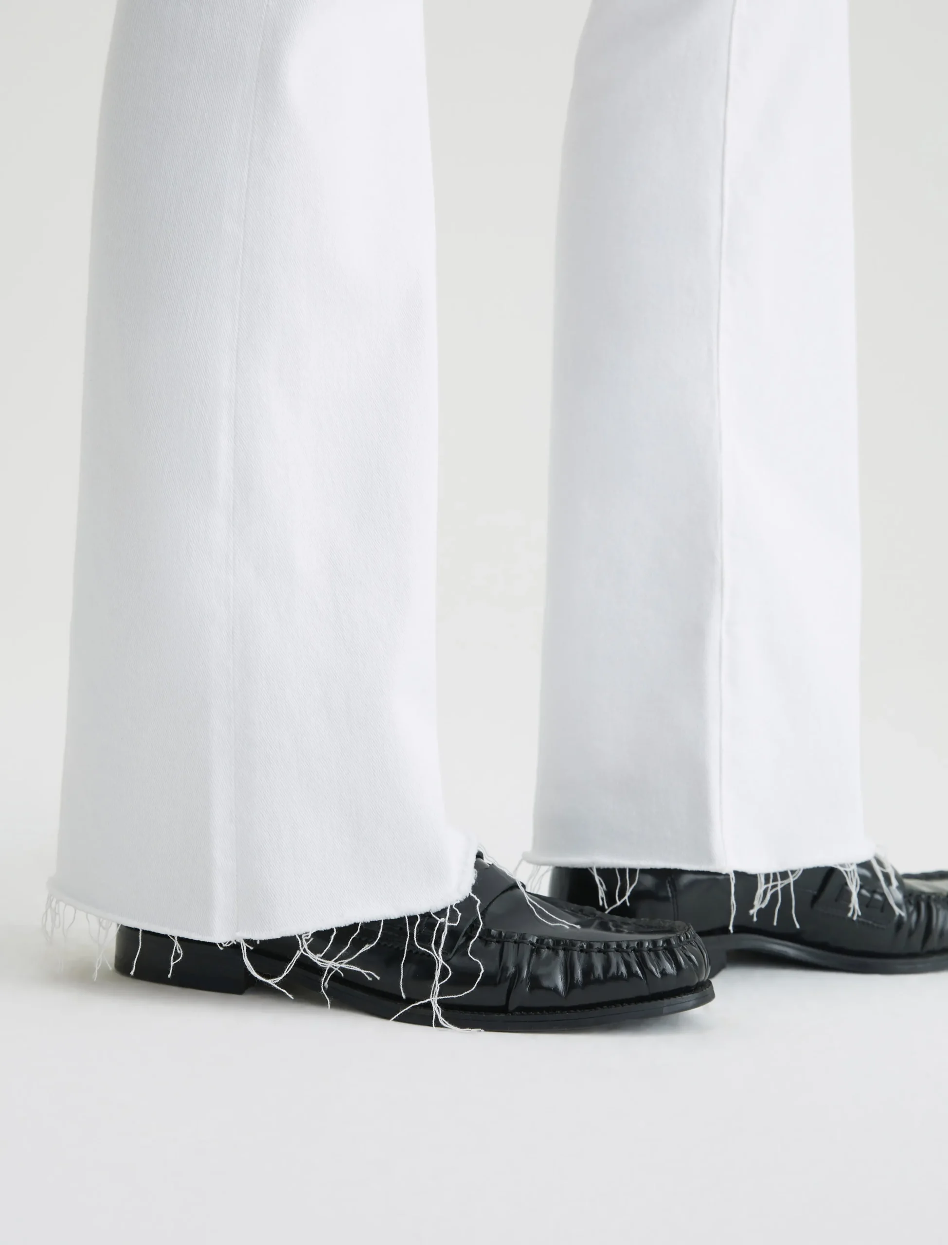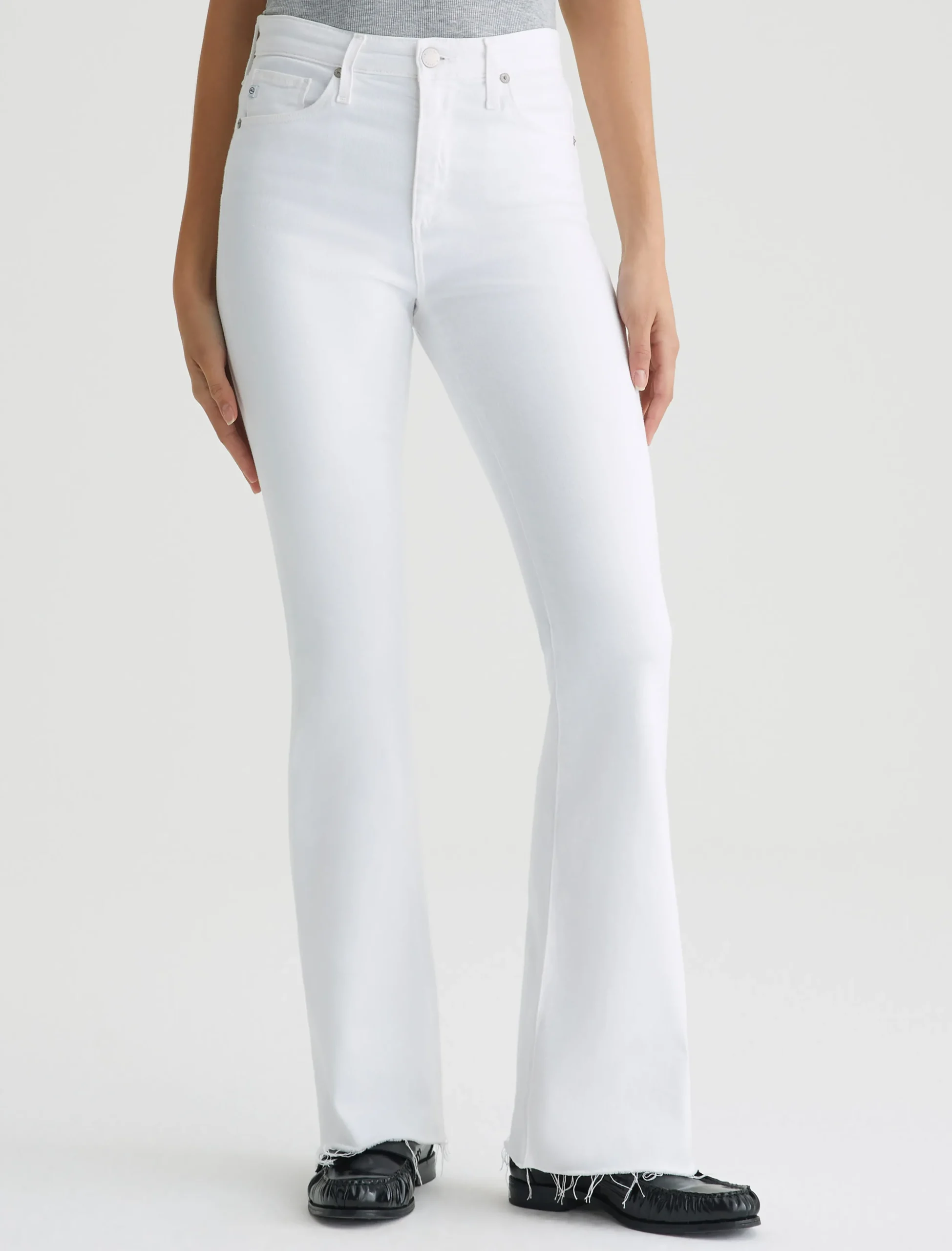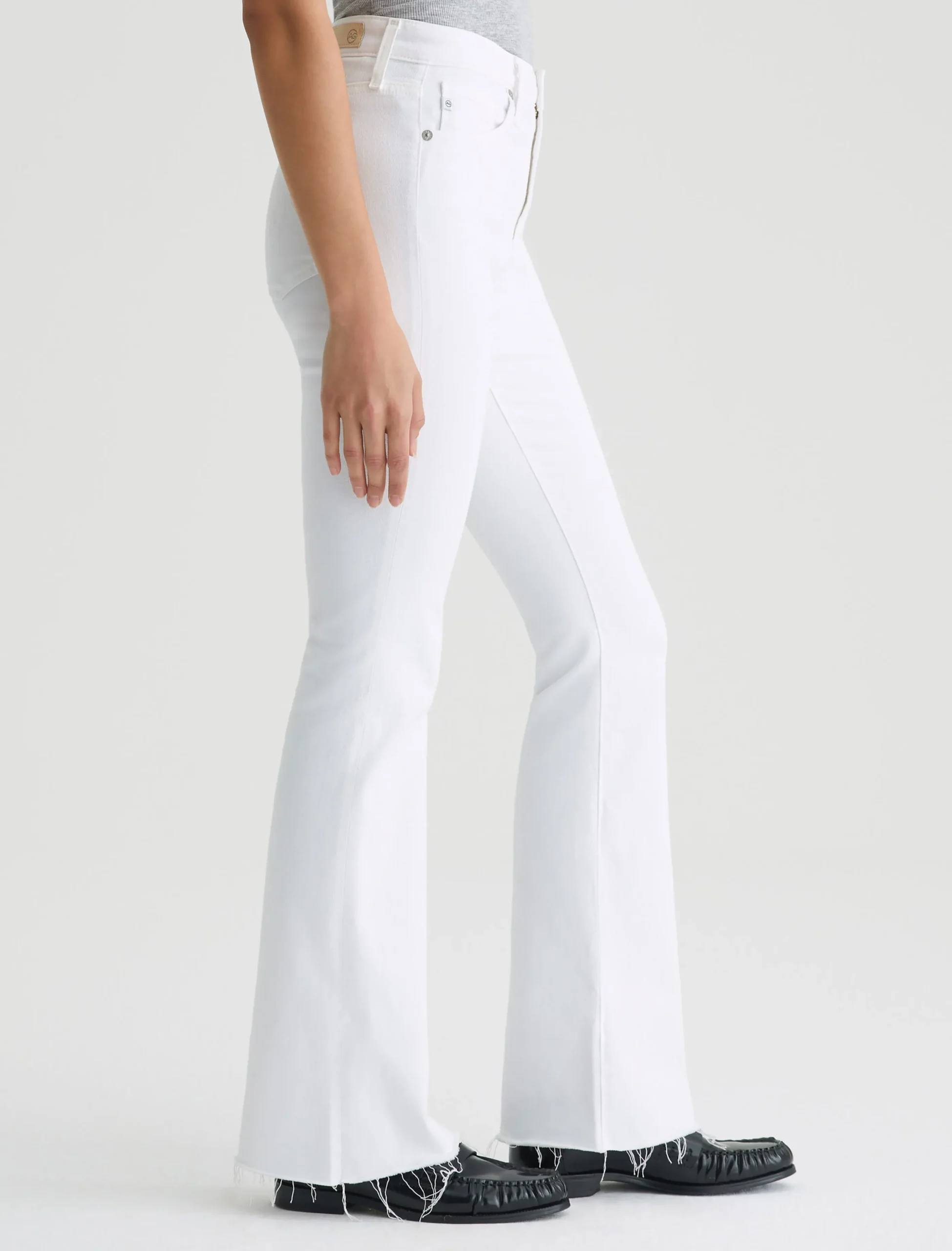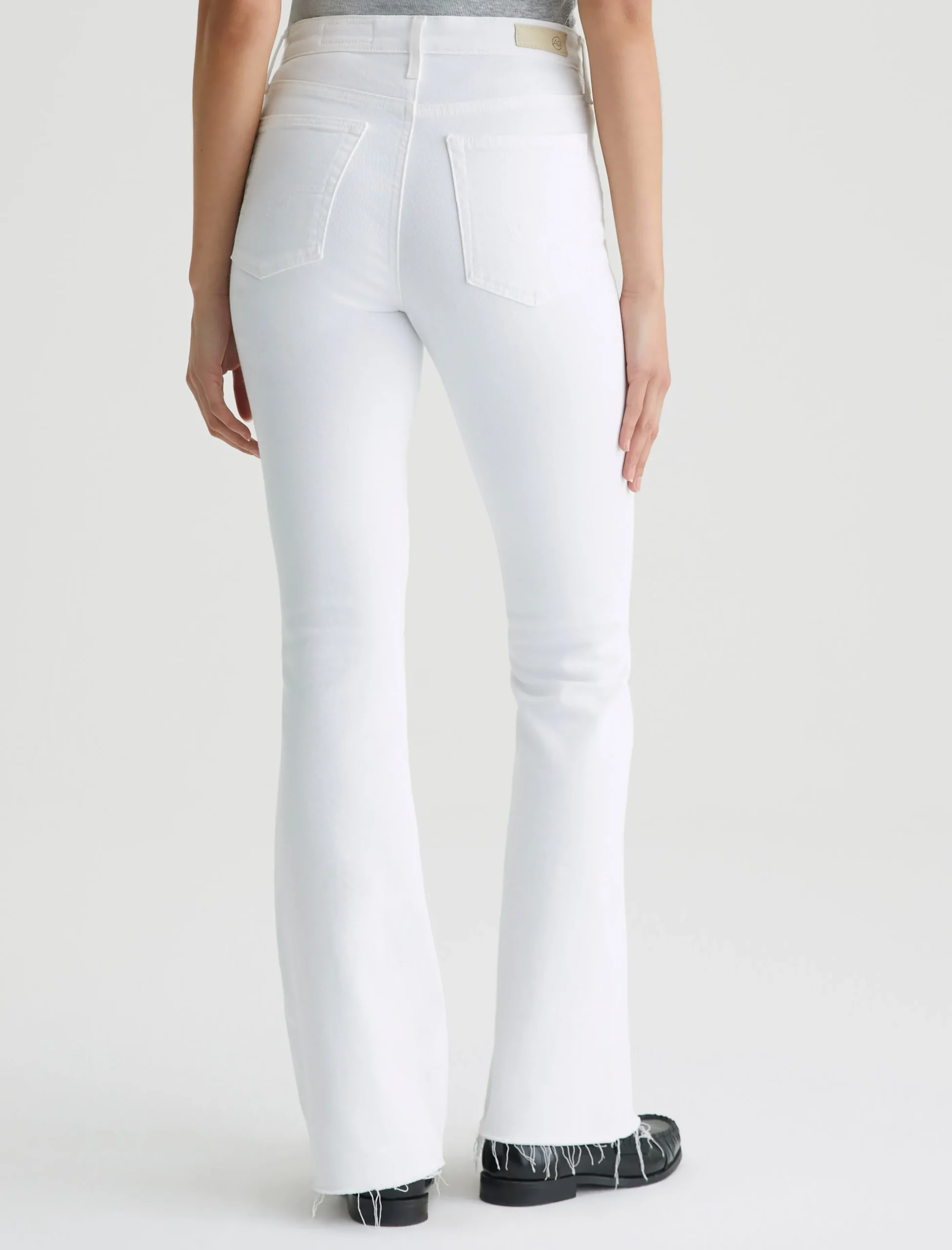The Farrah Boot is our mid-rise bootcut jean with raw, stringy hems. Done here in white, this pair sits right at the natural waist and has a skinny fit through the legs before opening into a subtly flared shape. It’s made from 9.7 oz. Hyper-Soft Stretch Denim, an exclusive AG Cloud Soft Denim™ fabric. The special left-hand twill construction allows the yarns to gently relax and untwist for a luxe, supple feel that gets even softer with wear.