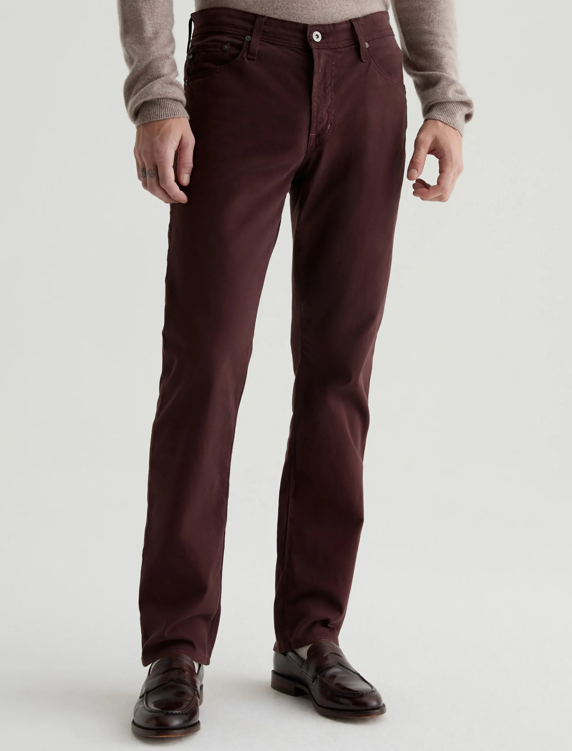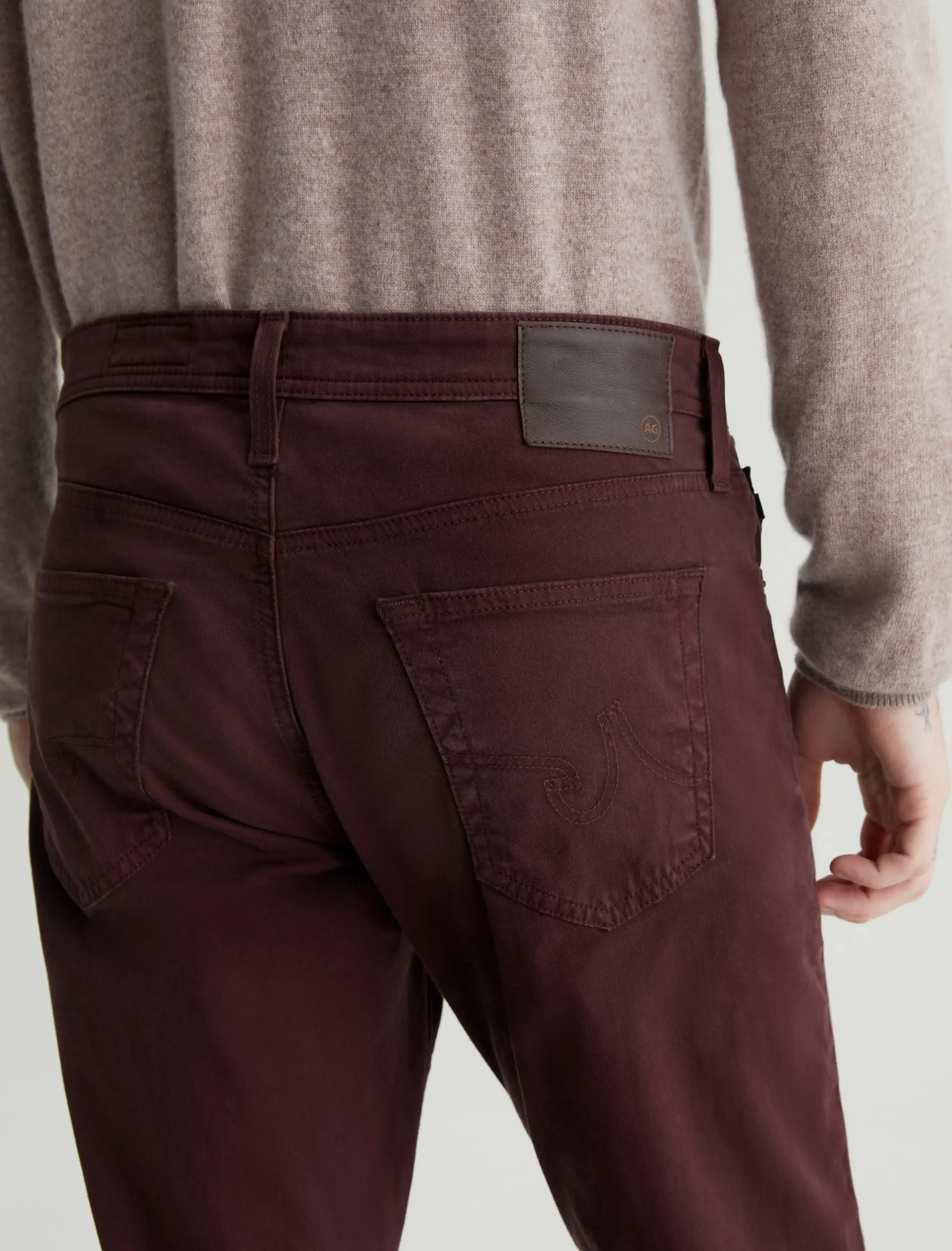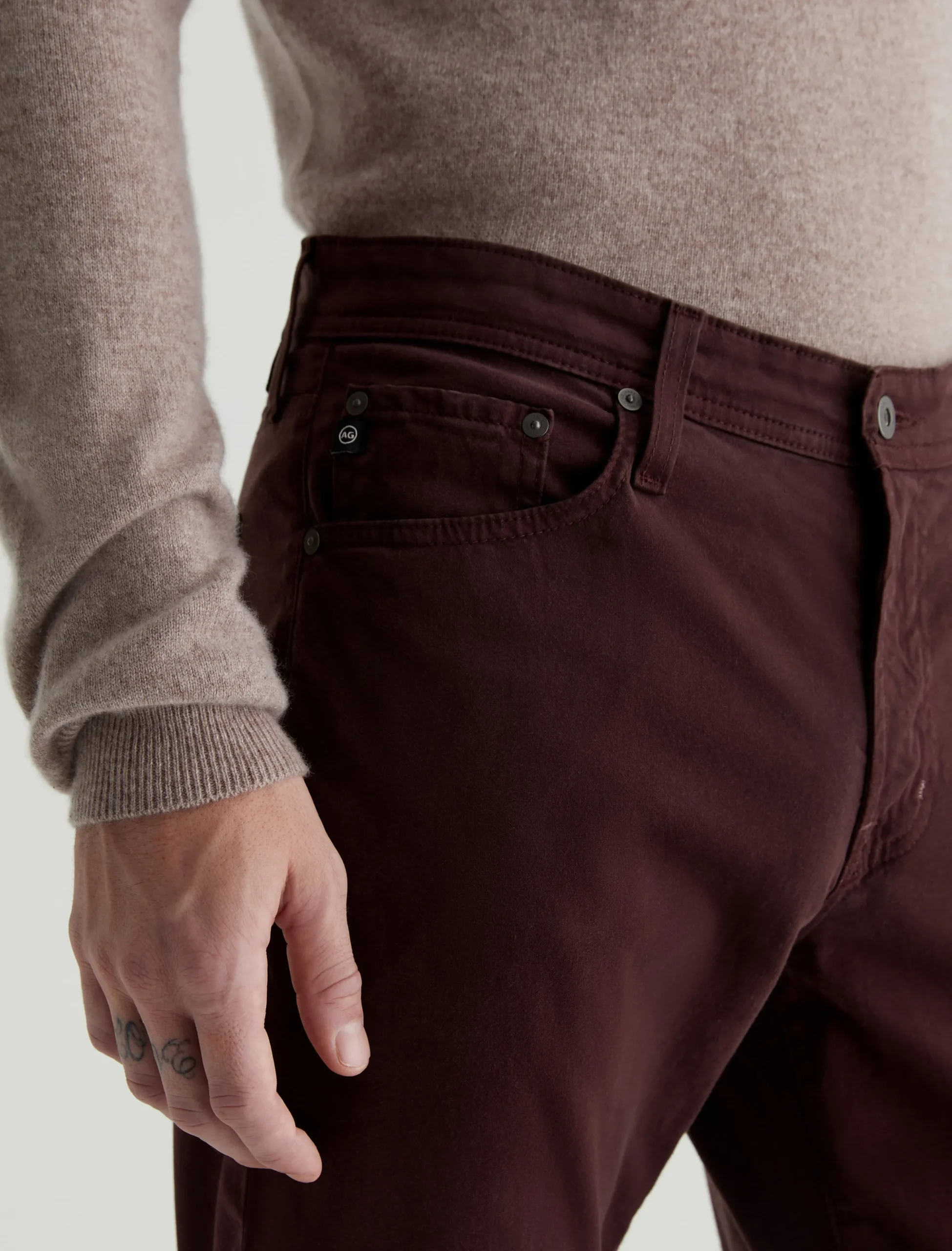 The Graduate is a tailored leg jean for men, updated here in 8.4 oz. Sueded Stretch Sateen with a soft, refined texture. Done in a rich burgundy shade, this 5-pocket pair has a slim mid-rise waist and a relaxed fit from hip to knee before tapering at the leg opening.