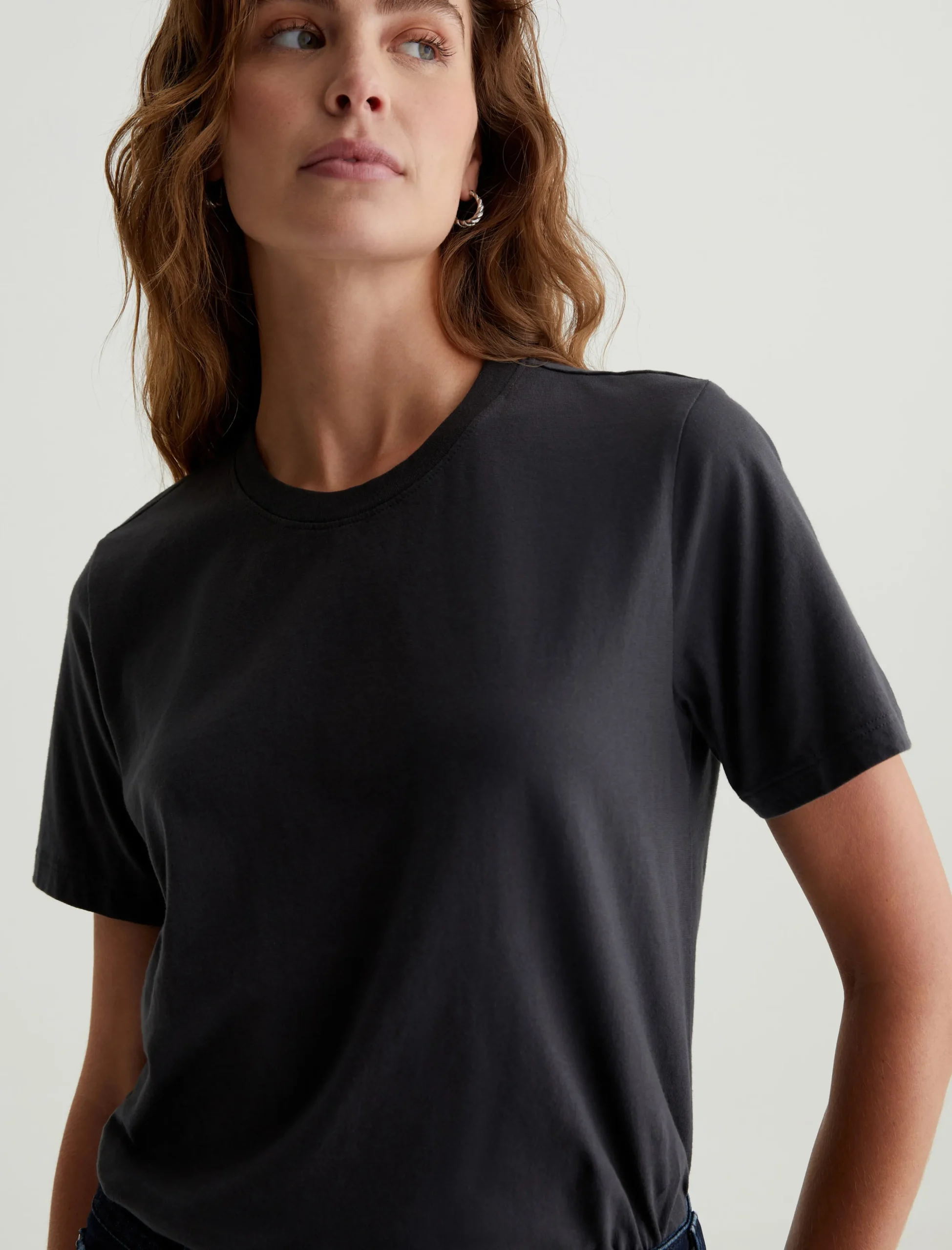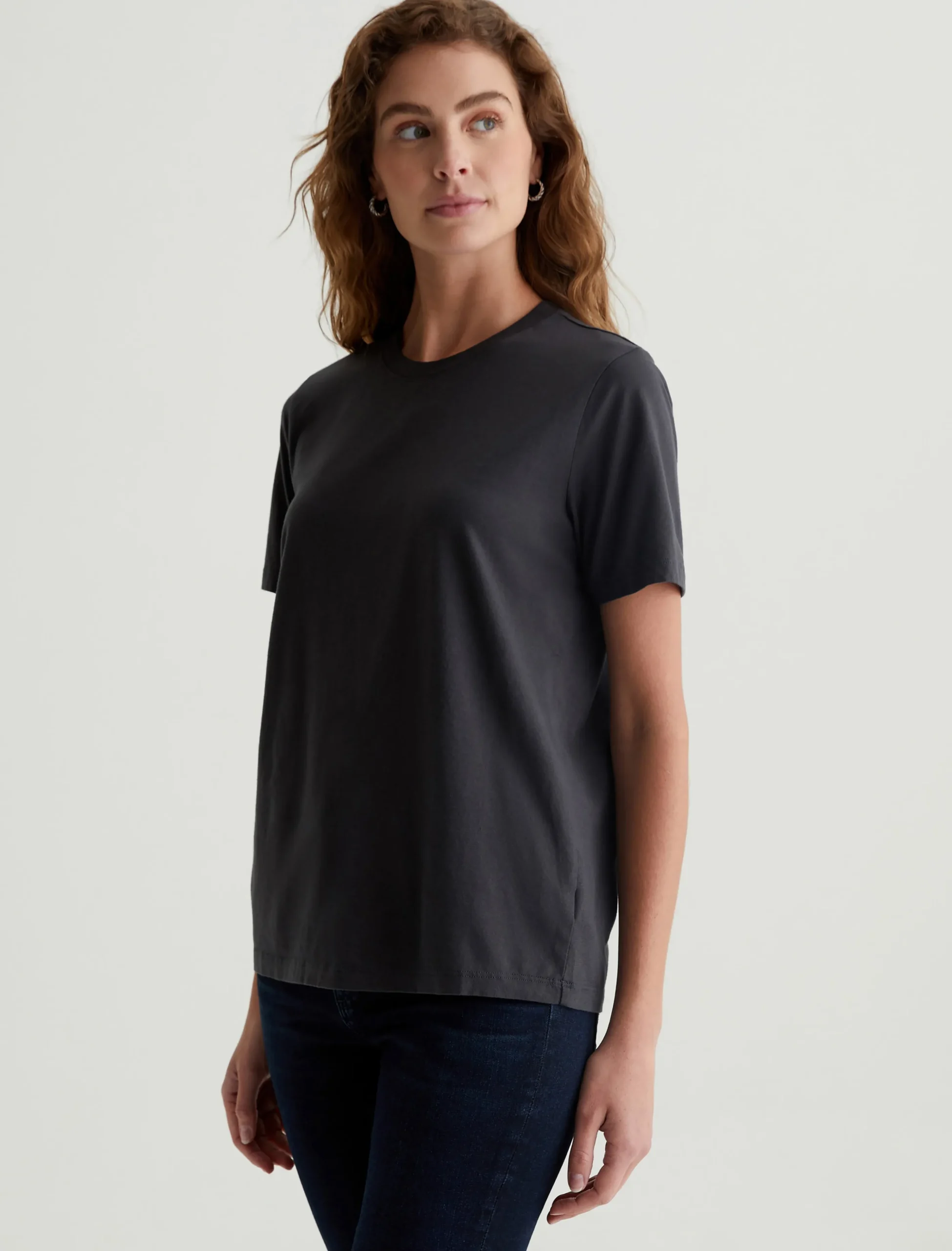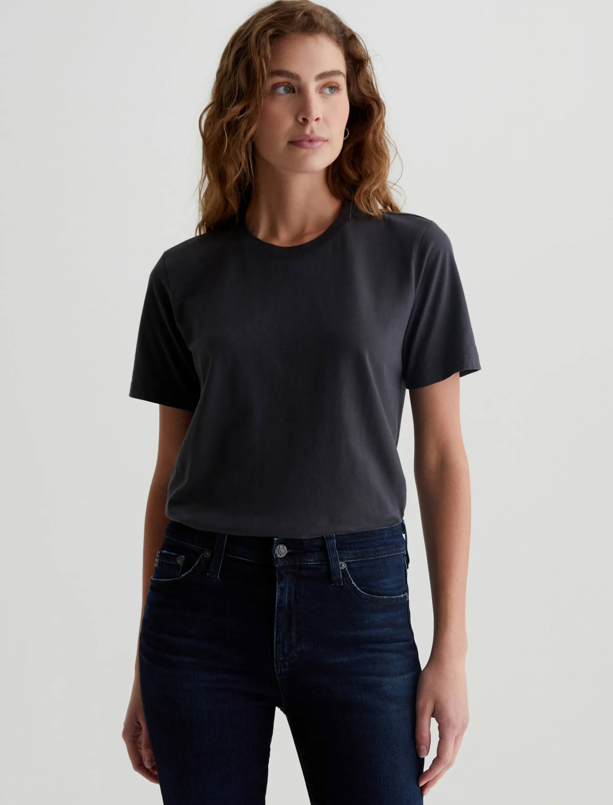 Our Jagger Crew Neck is the perfect short sleeve tee for your assortment of basic essentials. Featuring a dark grey hue, this classic crew offers a 1X1 rib neckband. Seasonless, elevated, and luxurious—this fabrication and fit provides unique versatility in styling your everyday look. Our Jersey Knit offers a luxurious comfort that is unrivaled—knitted with both S-twist and Z-twist yarn to sustain longevity and stability, preventing unnecessary twisting and torquing. During the production process, the S-twist yarn is spun counter-clockwise creating a right-handed twill. The Z-twist yarn works in opposition, spinning clockwise for a left-handed twill. This opposition—when working together—yields a softer, more durable fabrication and gives strength to the yarn making it more difficult to pull apart. Designed in 100% Cotton.