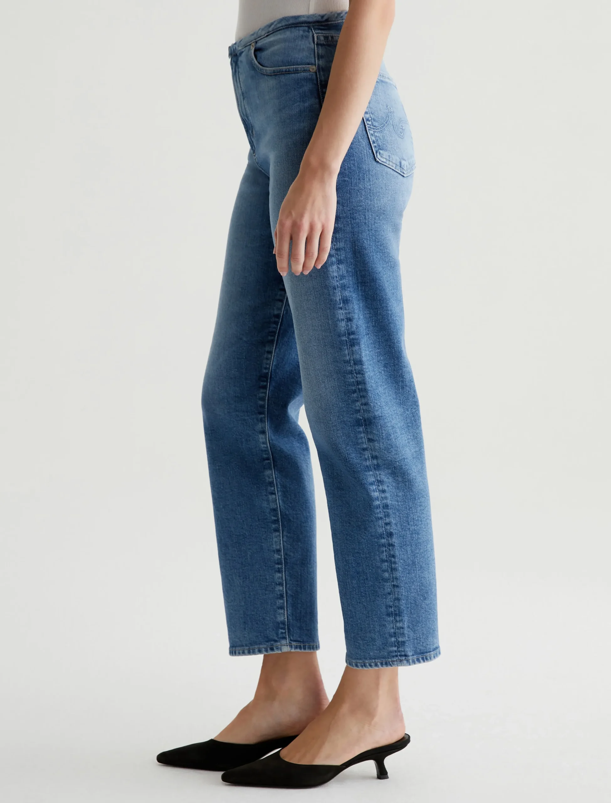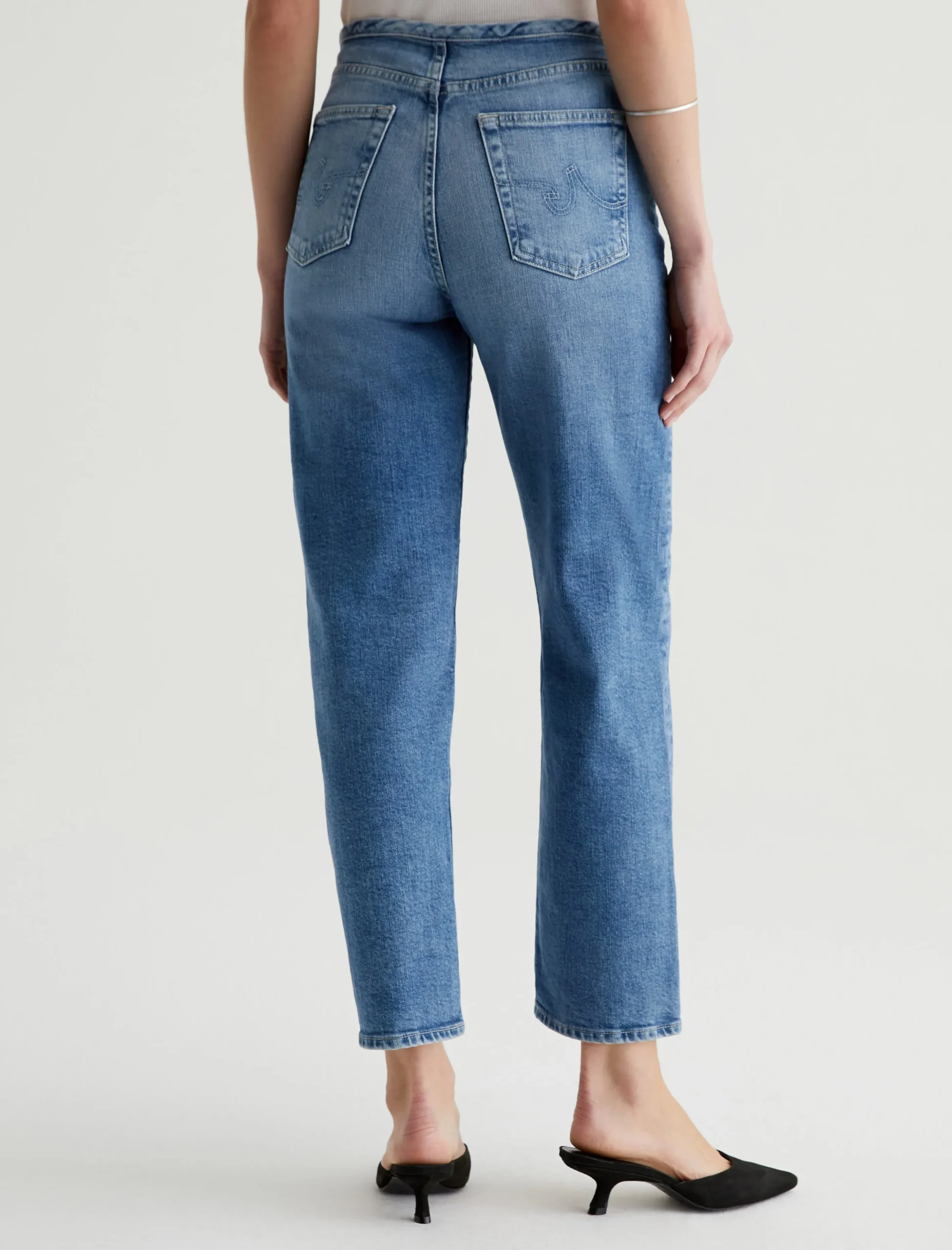 Our Rian high-rise straight, updated with a chopped waistband. It’s got a zip fly with a concealed button closure. The pair has a super-high waist and a roomy cut through the hips and legs, landing at an ankle-skimming length. These five-pocket women’s jeans are crafted from 11.75 oz. Vintage Comfort Stretch Denim in a faded light indigo wash.