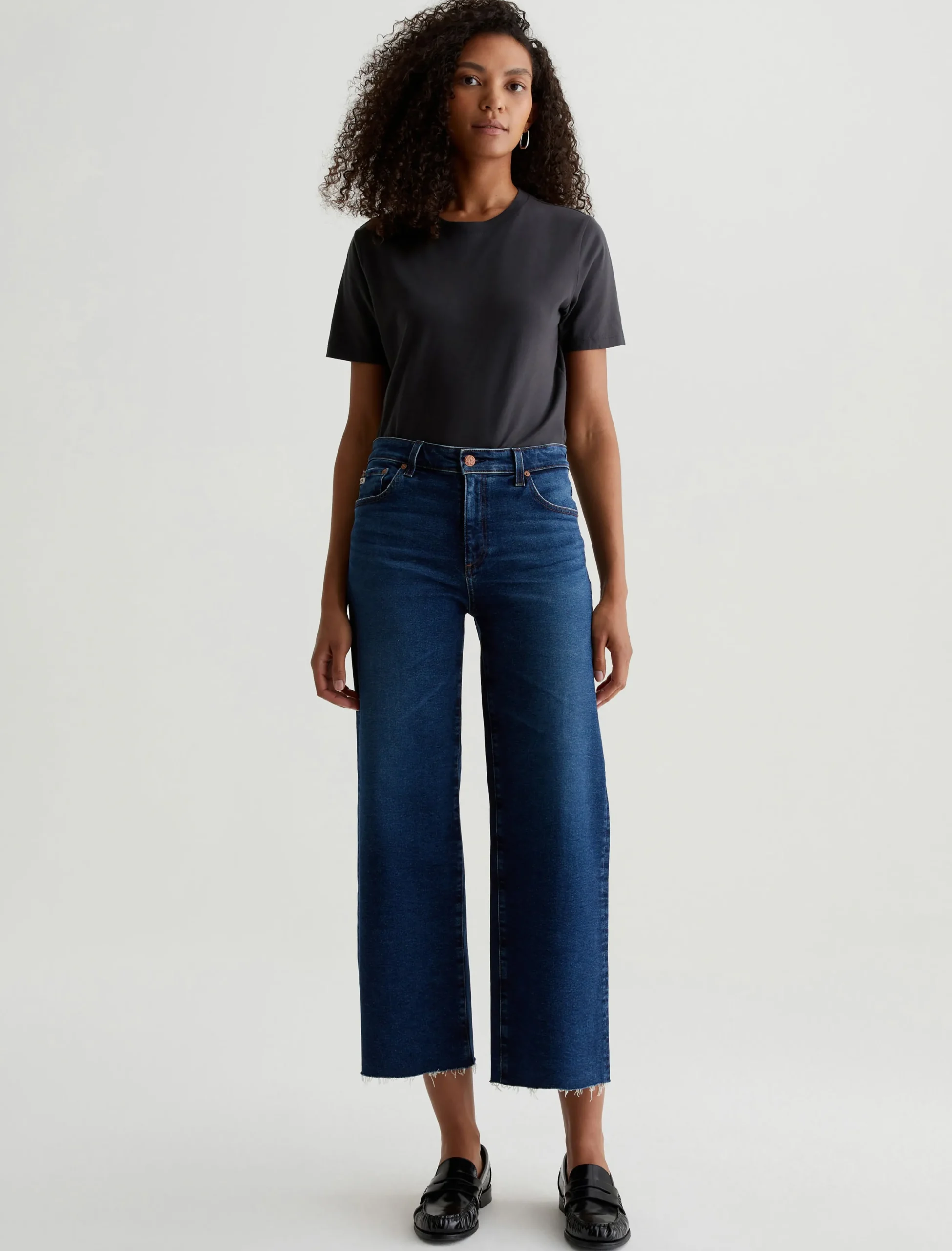 The Saige Wide Leg Crop features a mid-rise waist and loose, cropped legs with raw hems. Made in 12 oz. Classic Comfort Stretch Denim from Italy, this pair has an AG-ed™ dark blue wash with fading, whiskering, and worn edges. Marigold stitching finishes the five-pocket design.