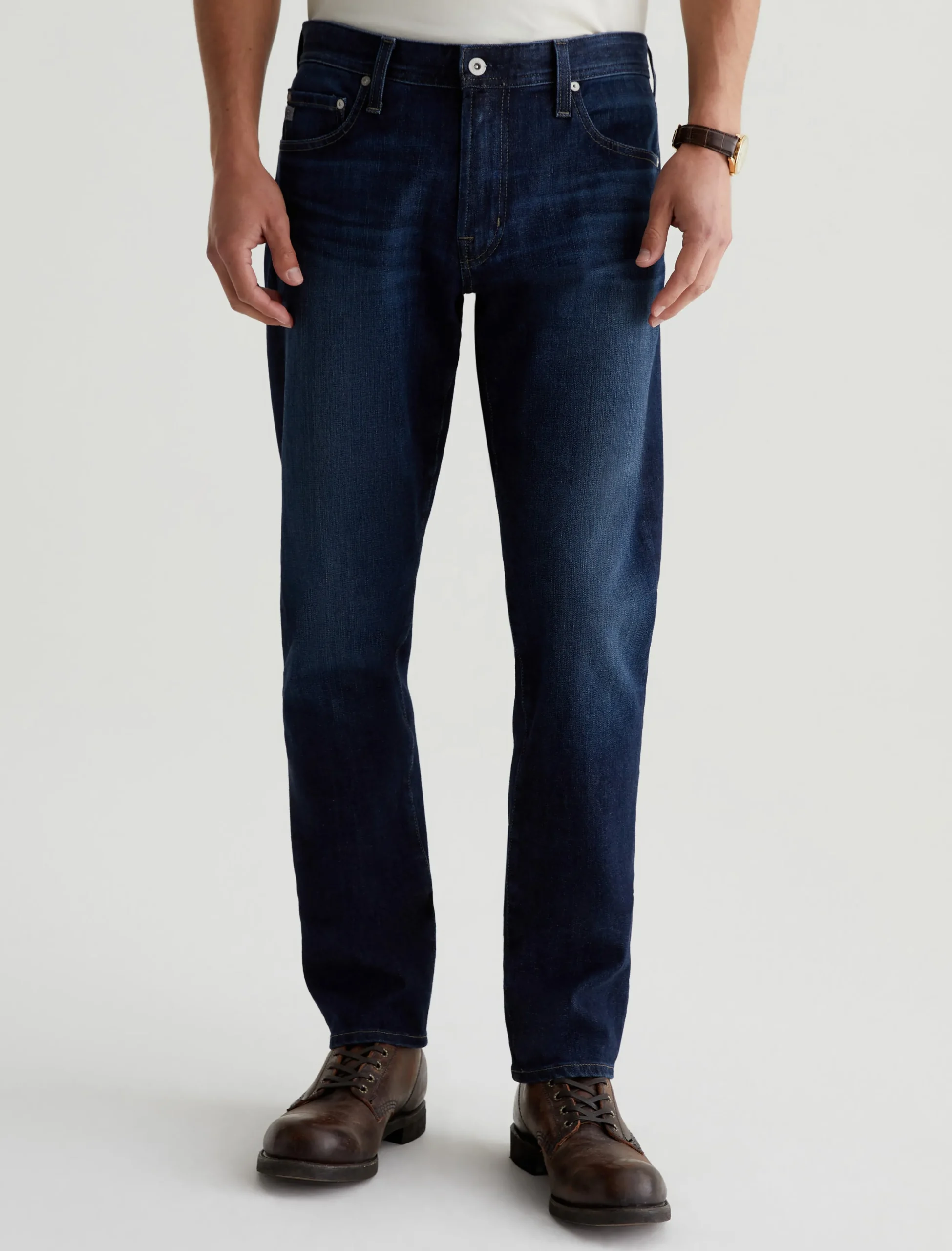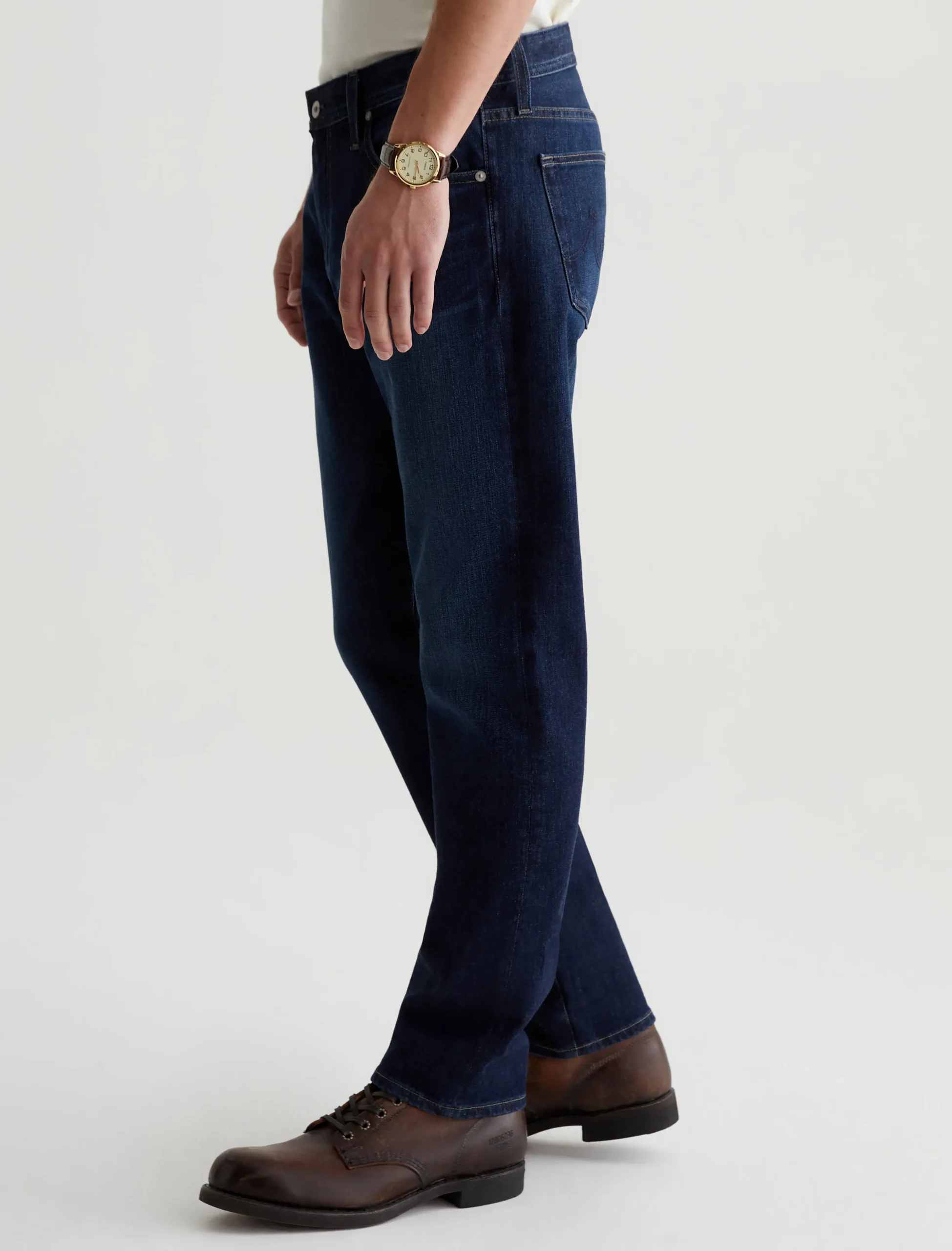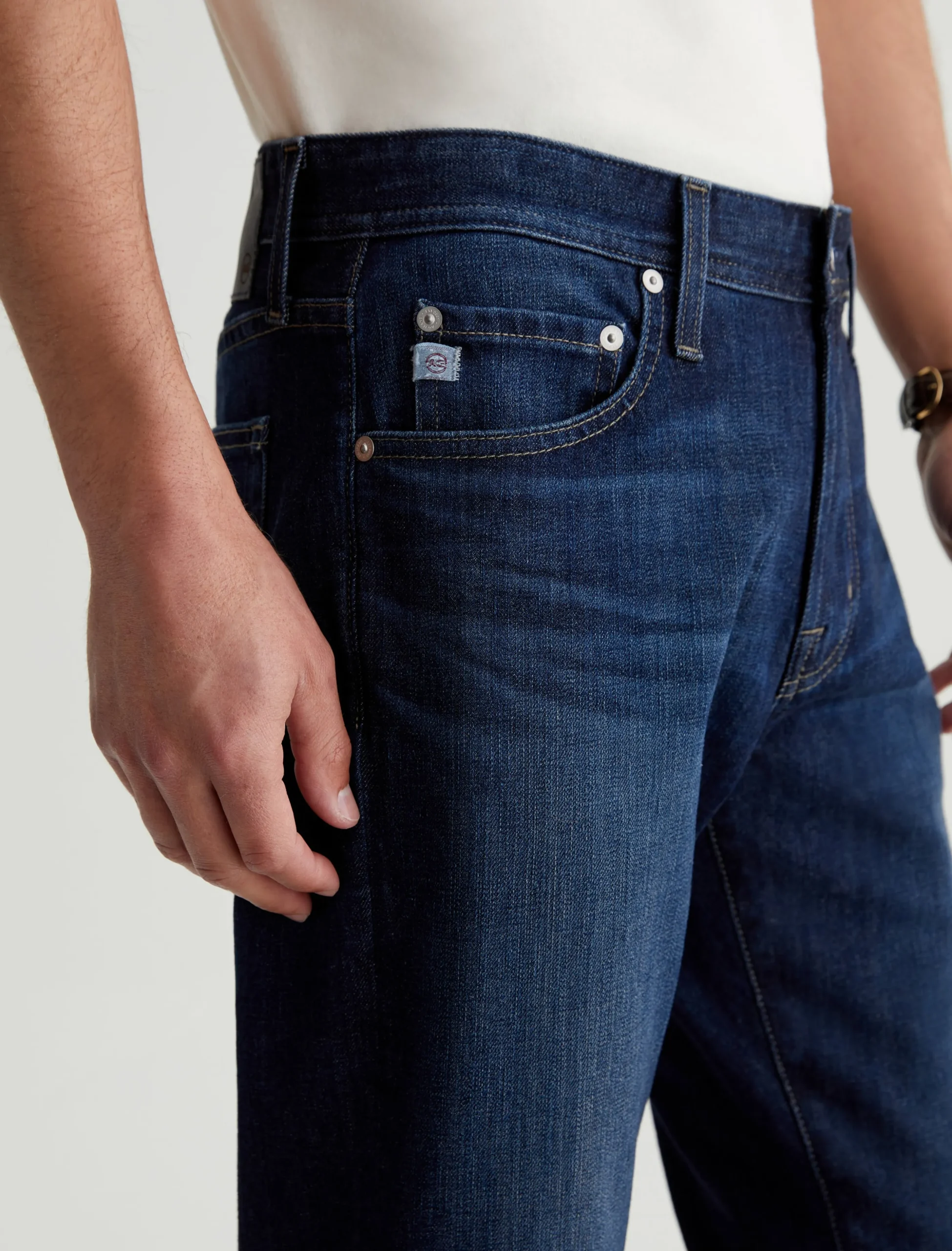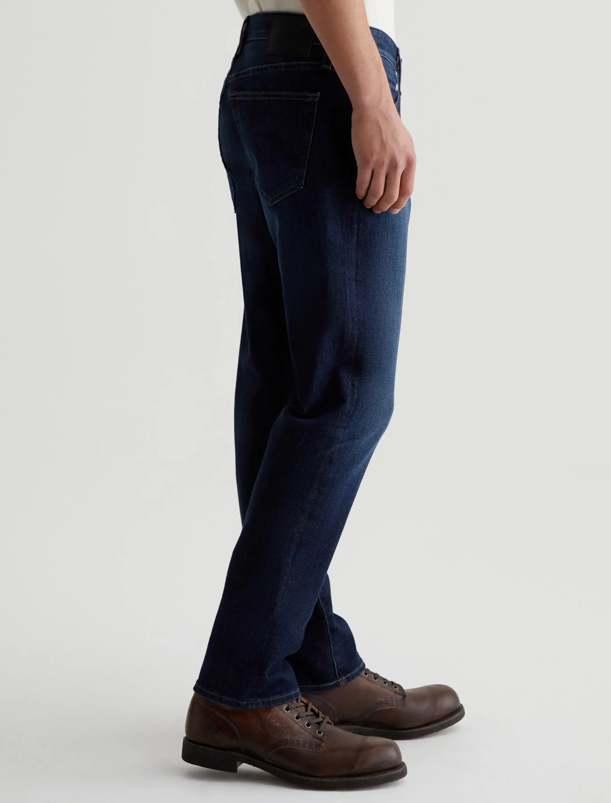 Our Tellis 360° is a modern slim featuring a fitted upper block and tapered leg opening. It’s done in a dark indigo wash with a bit of fading and whiskering. These slim-cut men’s jeans are incredibly comfortable and easy to wear in 11 oz. Flex 360° Denim from Japan.