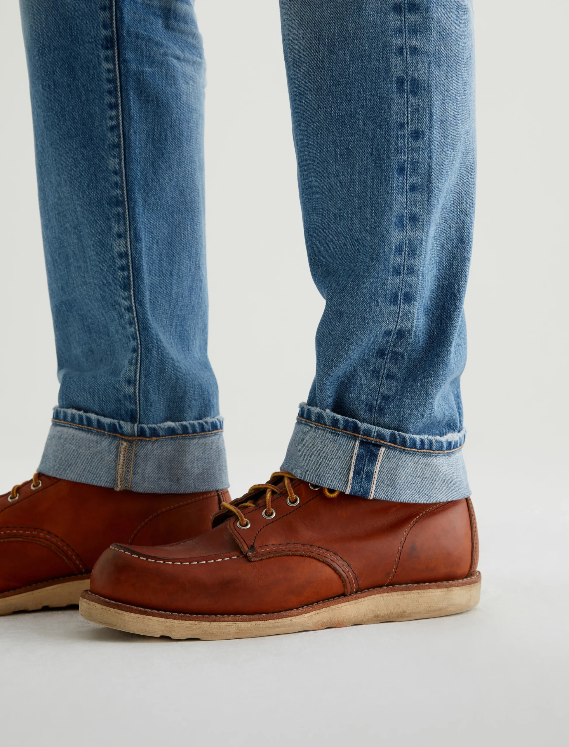 Our Tellis modern slim men’s jean, updated in midweight 12 oz. Robecchetto Rigid Selvage Denim from Italy’s famed Candiani Denim mill. Candiani uses innovative eco-friendly technology to craft this 100% cotton 3×1 right-hand twill denim. Tellis has a fitted upper block and tapered leg openings. These five-pocket slim-fit jeans have a medium indigo stonewash with an AG-ed™ 24-year fade, slightly distressed pocket edges, and a hint of wear at the hems. Detailed by a red ticker along the self-finished edge.