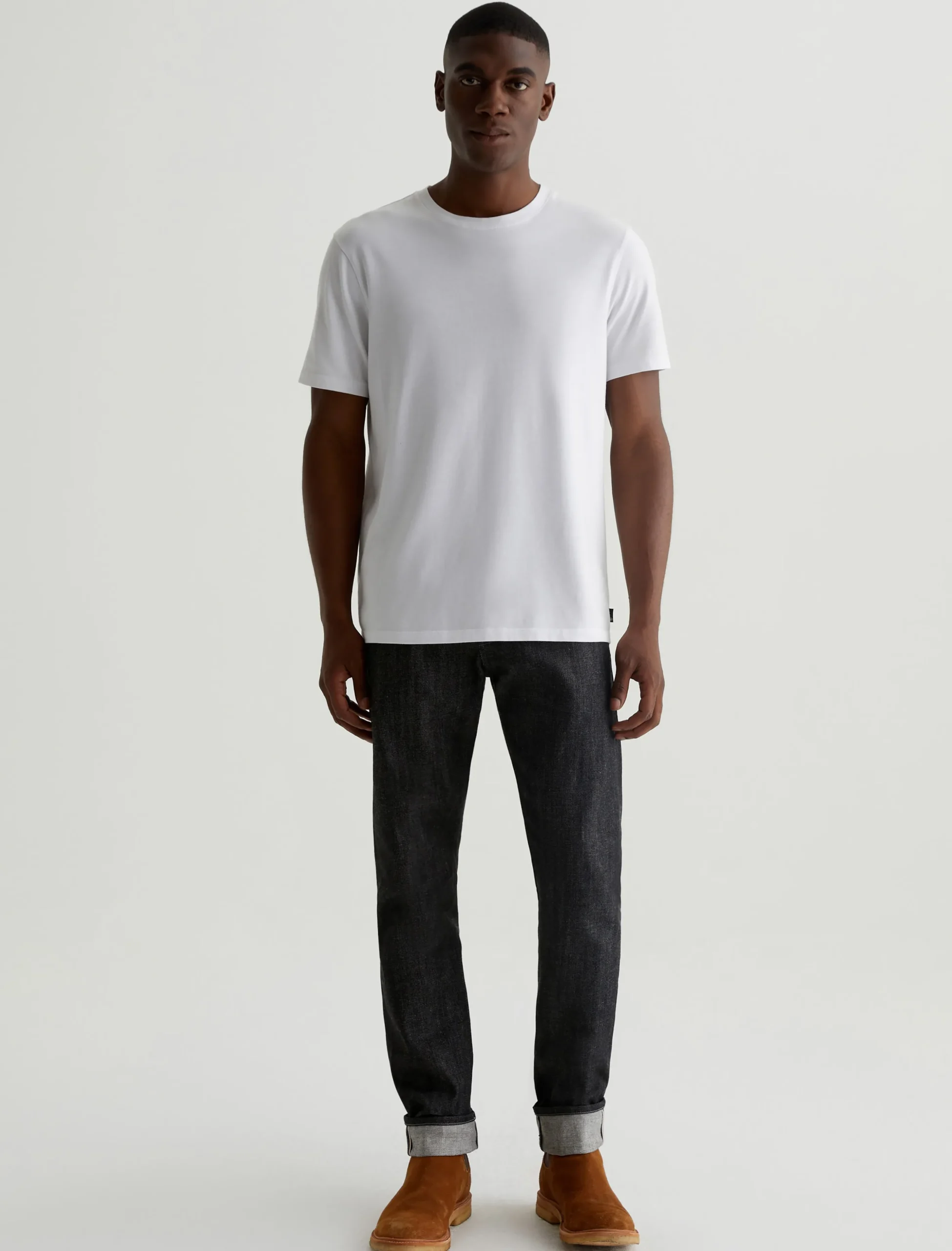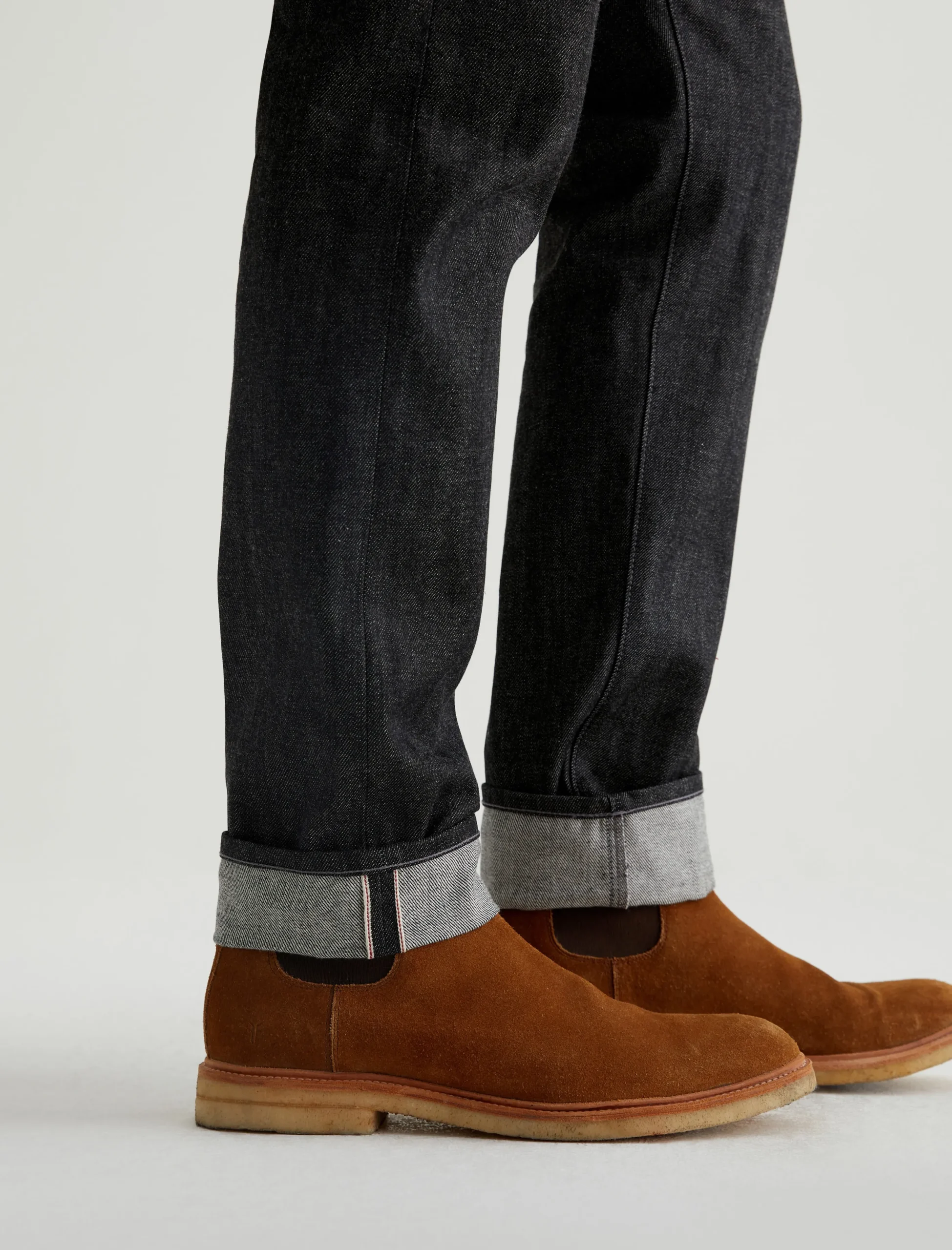 The Tellis Modern Slim Jean for men features midweight 12.89 oz. Black Rigid Selvage Denim from Japan’s Kuroki Co. The style is designed with a fitted top block and a tapered leg opening. This men’s slim straight jean has 3×1 right-hand twill construction in 100% cotton that’s grown in the USA and spun for a subtle slub character. It’s roped-dyed for a black cast and detailed by a red ticker along the self-finished edge.