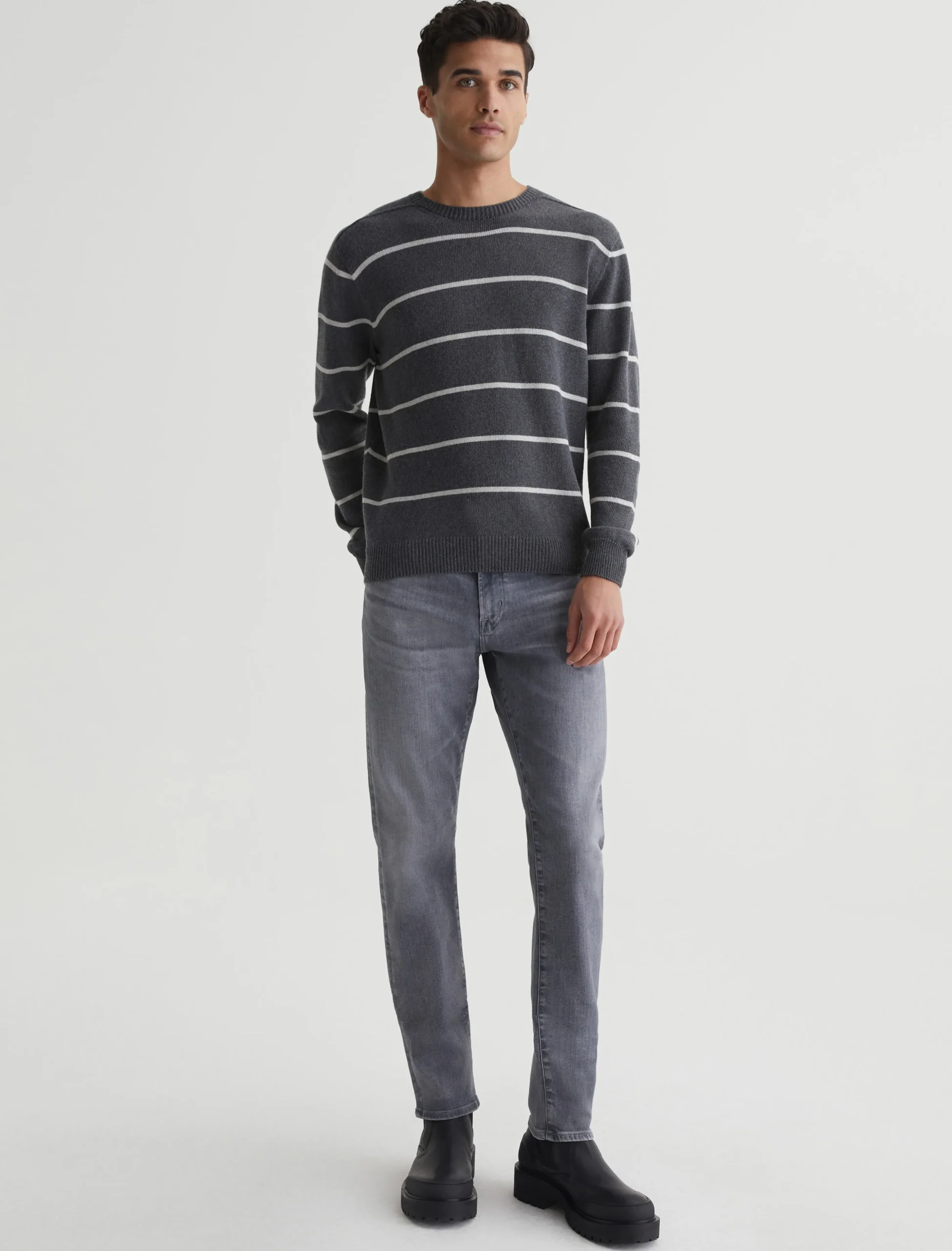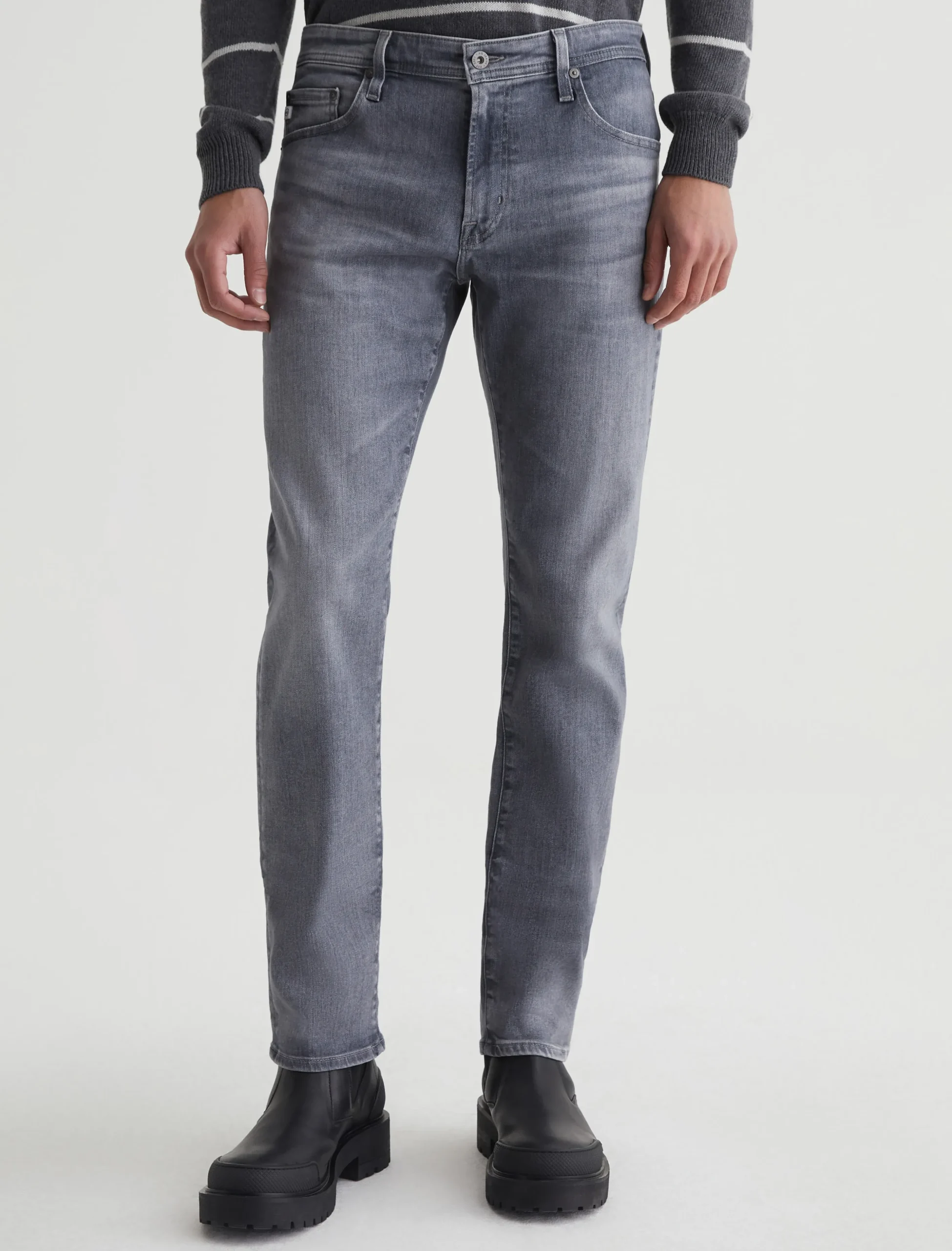 The Tellis modern slim jean for men features a faded grey wash with hazy whiskering. Defined by a fitted upper block and tapered leg opening, these five-pocket jeans are designed in 10 oz. Ashen Stretch Denim for premium comfort. Our AG Vapor Wash™ process significantly reduces the use of water, chemicals, and energy to lessen environmental impact. Finished with a vegan and 100% biodegradable cellulose patch at the back waistband.