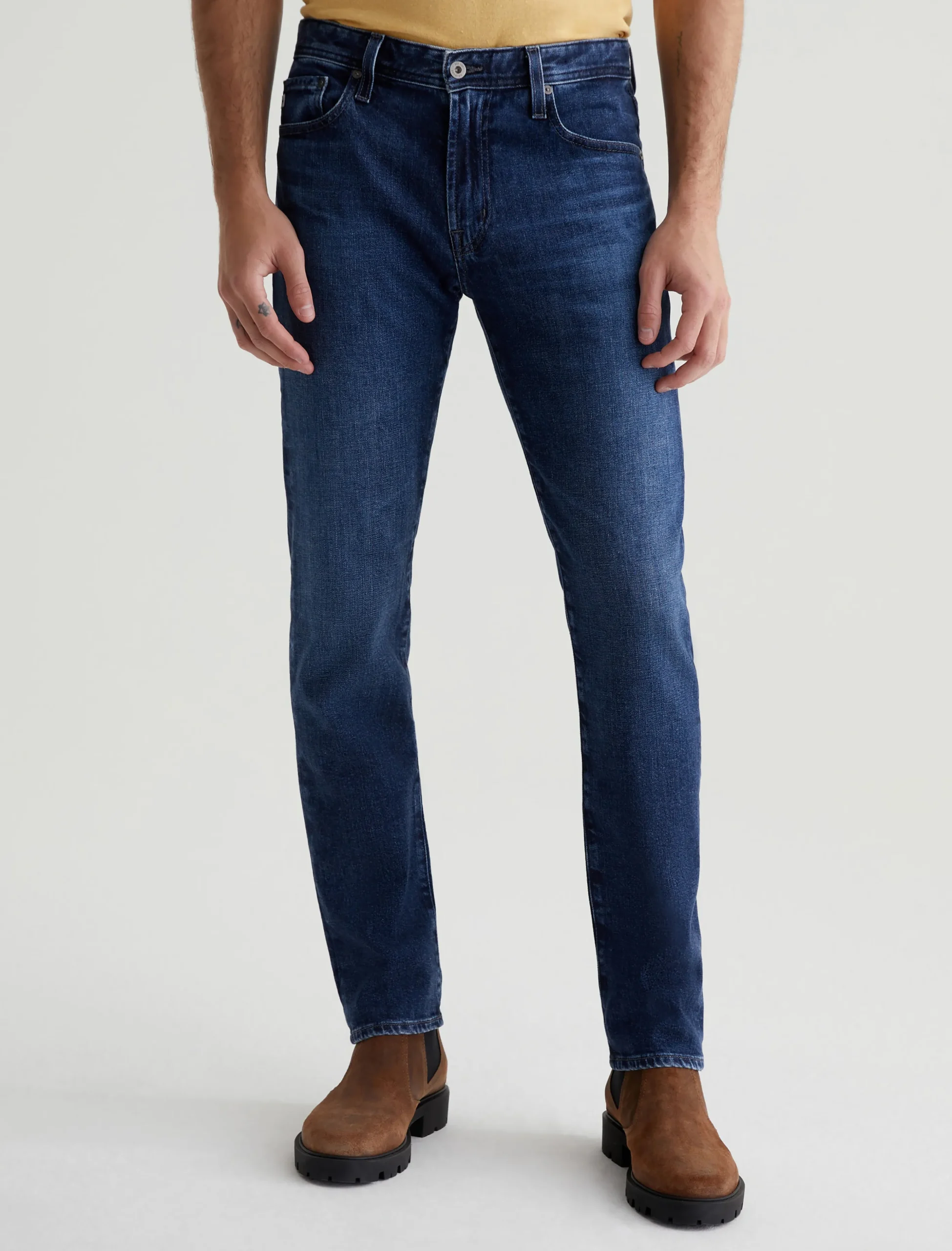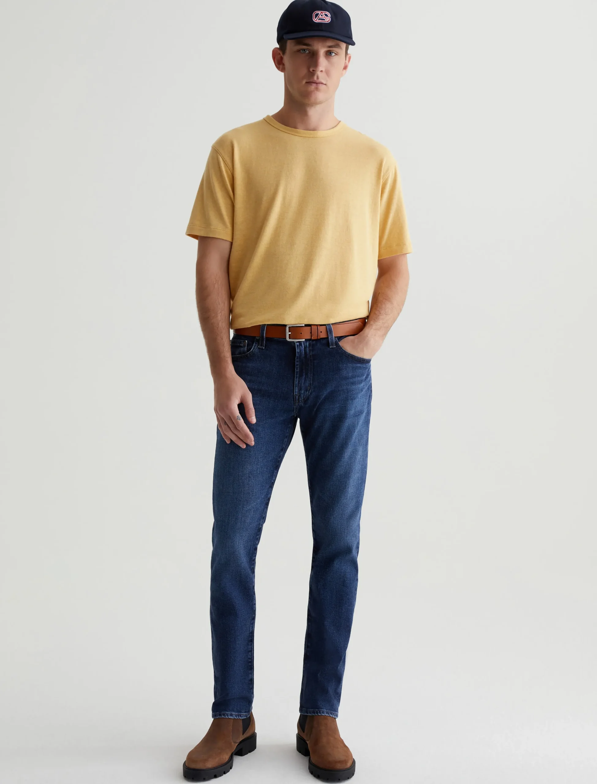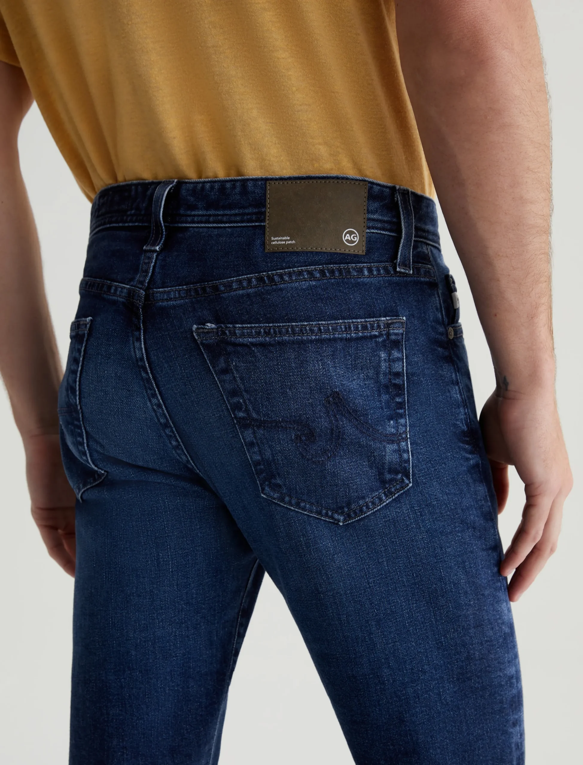 The Tellis modern slim jean for men comes in a dark indigo wash with fading and whiskering for a broken-in look. Featuring a fitted upper block and tapered leg openings, these men’s slim-fit jeans are crafted from comfortable 10 oz. Daytripper Stretch Denim. Our AG Vapor Wash™ process significantly reduces the use of water, chemicals, and energy to lessen environmental impact. Finished with a vegan and 100% biodegradable cellulose patch at the back waistband.