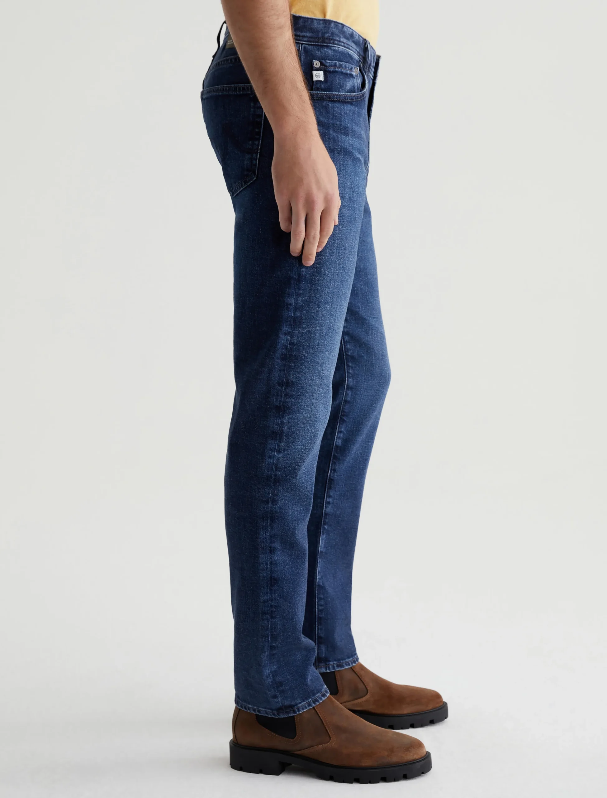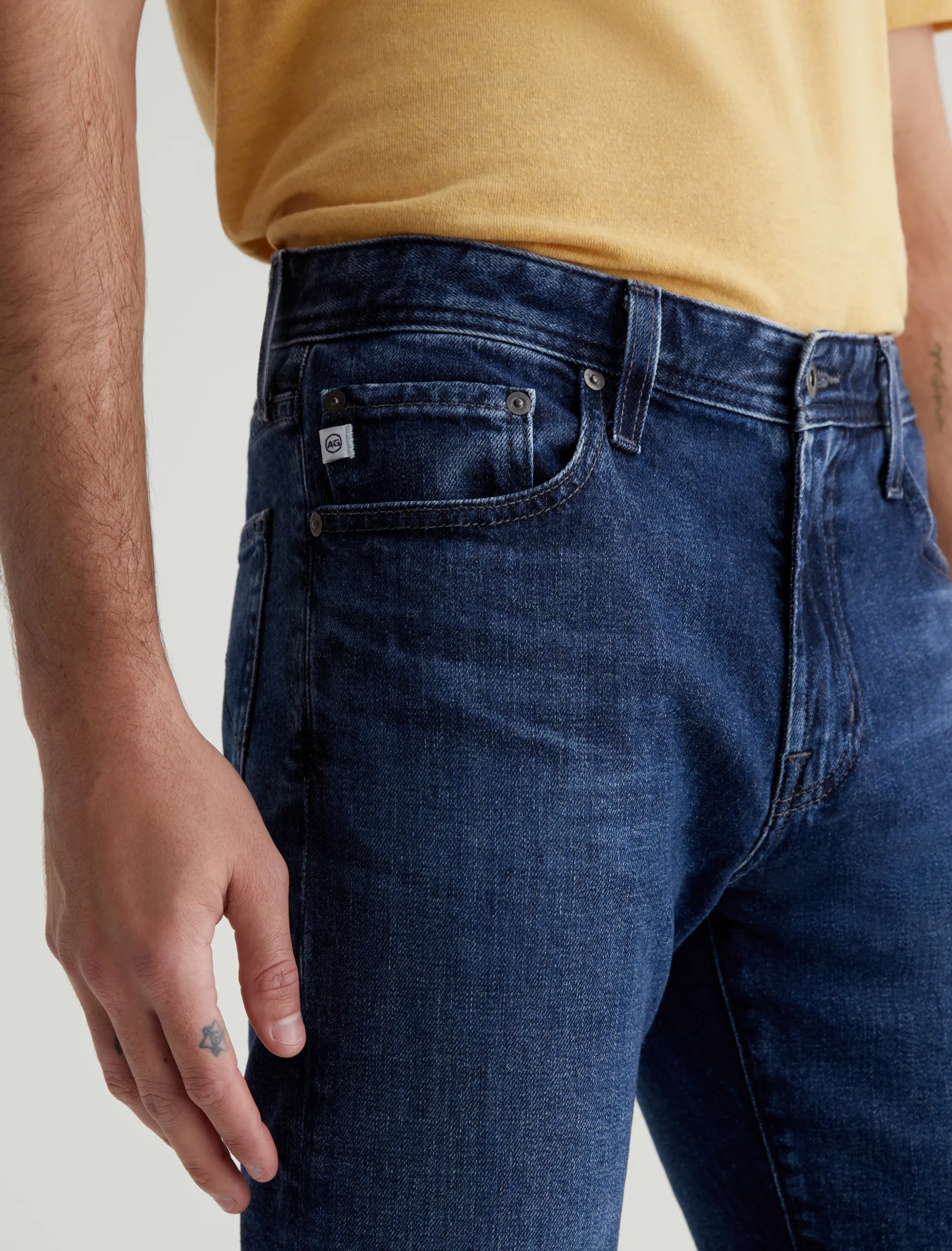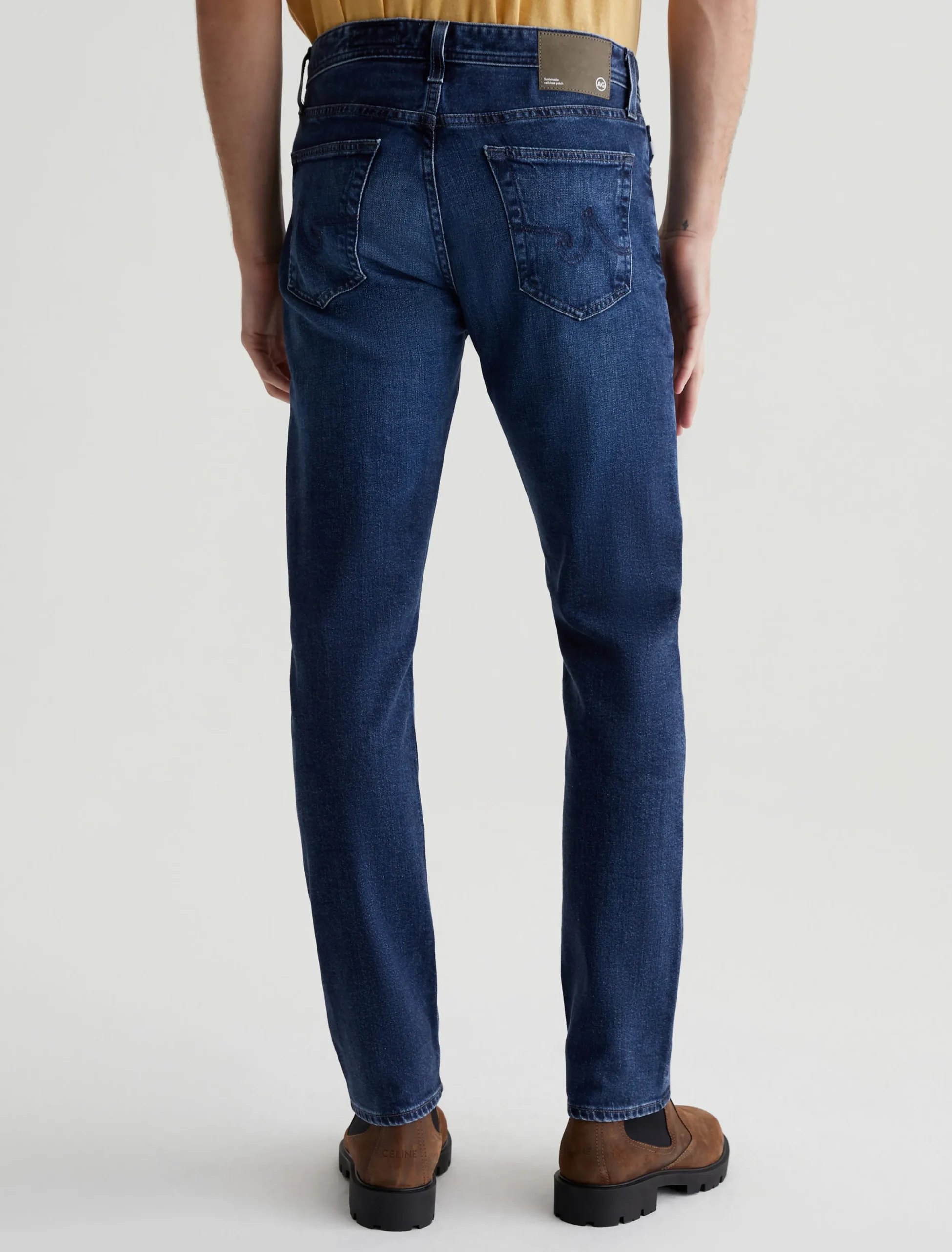 The Tellis modern slim jean for men comes in a dark indigo wash with fading and whiskering for a broken-in look. Featuring a fitted upper block and tapered leg openings, these men’s slim-fit jeans are crafted from comfortable 10 oz. Daytripper Stretch Denim. Our AG Vapor Wash™ process significantly reduces the use of water, chemicals, and energy to lessen environmental impact. Finished with a vegan and 100% biodegradable cellulose patch at the back waistband.